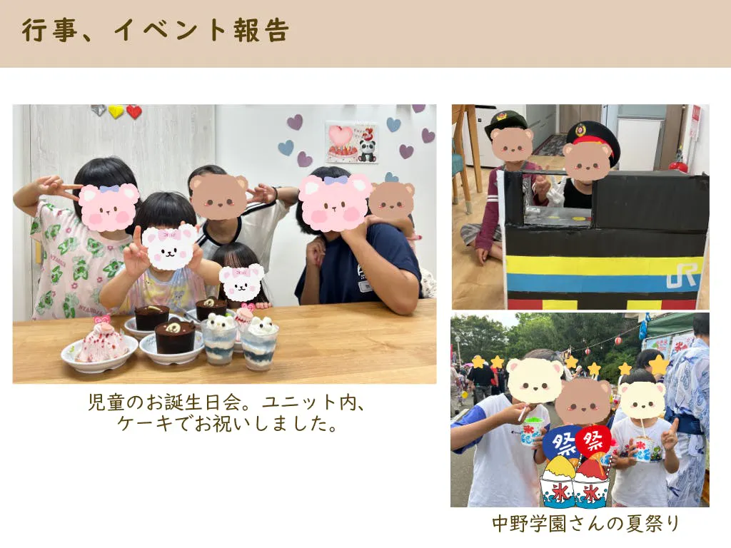 オリーブファミリアでは、開所してから、ウェルカムパーティー、誕生日会、バーベキュー、水遊び、流しそうめん、スイカ割り、花火、日帰り旅行など様々な行事やイベントを行ってきました。