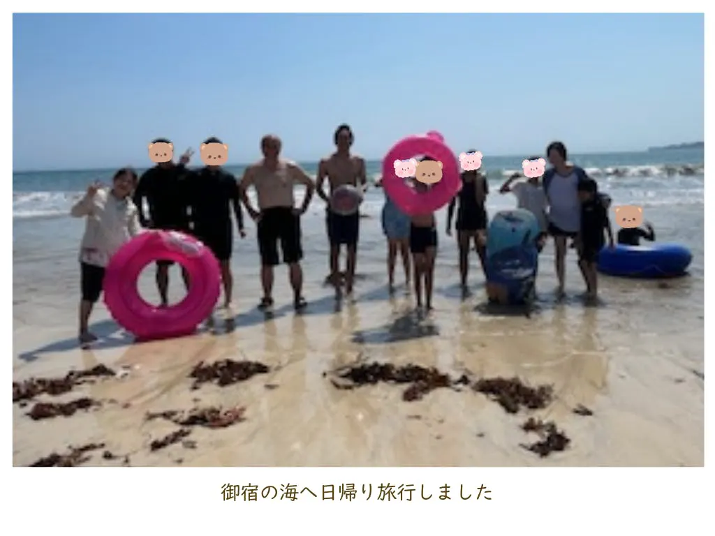 入所からの思い出を辿ってみると、子ども達と初めて出掛けたのは、4月に開催された法人内事業所オリーブ轟のオリーブマルクトです。そこで買い物やゲームを楽しんだ後、子ども達は稲毛海岸の海へ出掛けました。思う存分遊んだ後、「ただいまー!」と元気にファミリアに帰ってきた子ども達はとびっきりの笑顔。海岸遊びを存分に楽しんだ子ども達はそのままお風呂に直行。身体を洗い、みんなで湯舟に浸かり、「こんなに楽しかったのは初めて。」と楽しそうに話していた児童もいました。