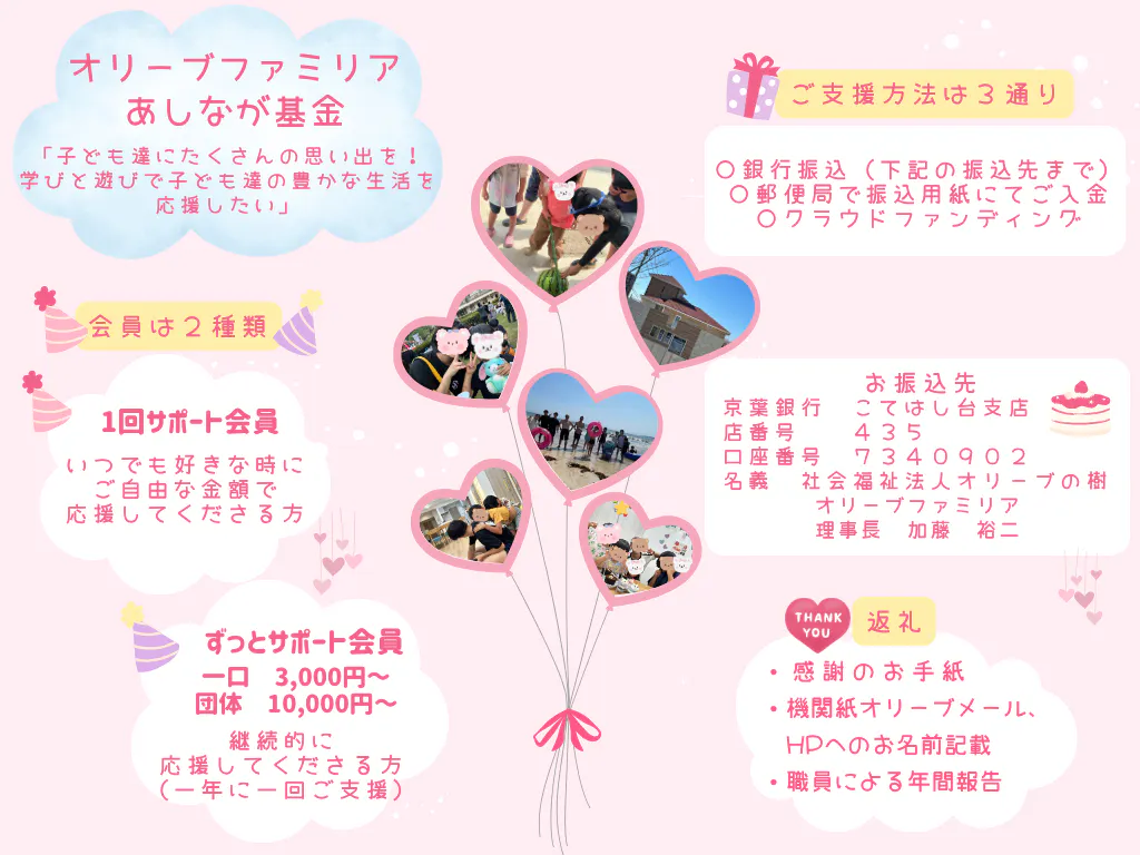 オリーブファミリアあしなが基金を設立し、安定した資金づくりを行い、入所する子ども達の遊びや学びを充実させたい。