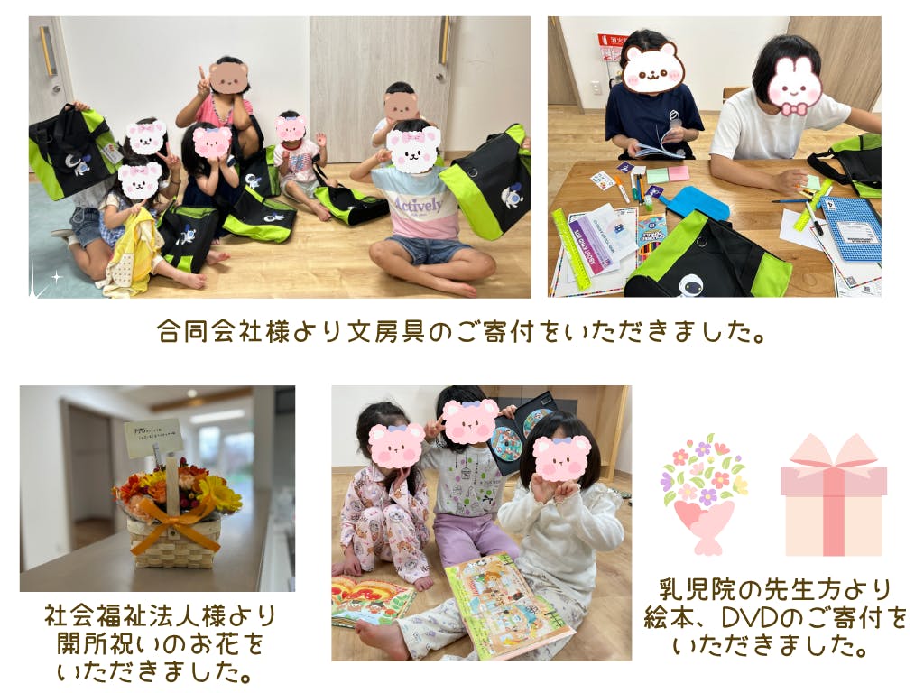 また、お下がりの洋服、一輪車、ストライダー、ベビーカー、チャイルドシートをくださった方、新品のDVDプレイヤーやギフトカード、お菓子などをプレゼントしてくださった理事の方、鳩時計、開所祝いのお花をプレゼントしてくださった社会福祉法人様、文房具100セットを贈ってくださった合同会社様、絵本やDVD・個人宛ての贈り物をプレゼントしてくださった乳児院の先生方、DSやNintendo switchのソフト、ぬいぐるみ、トイレトレーニンググッズをくださった職員の方々、絵本や洋服を定期的に届けてくださる職員の方もいます。