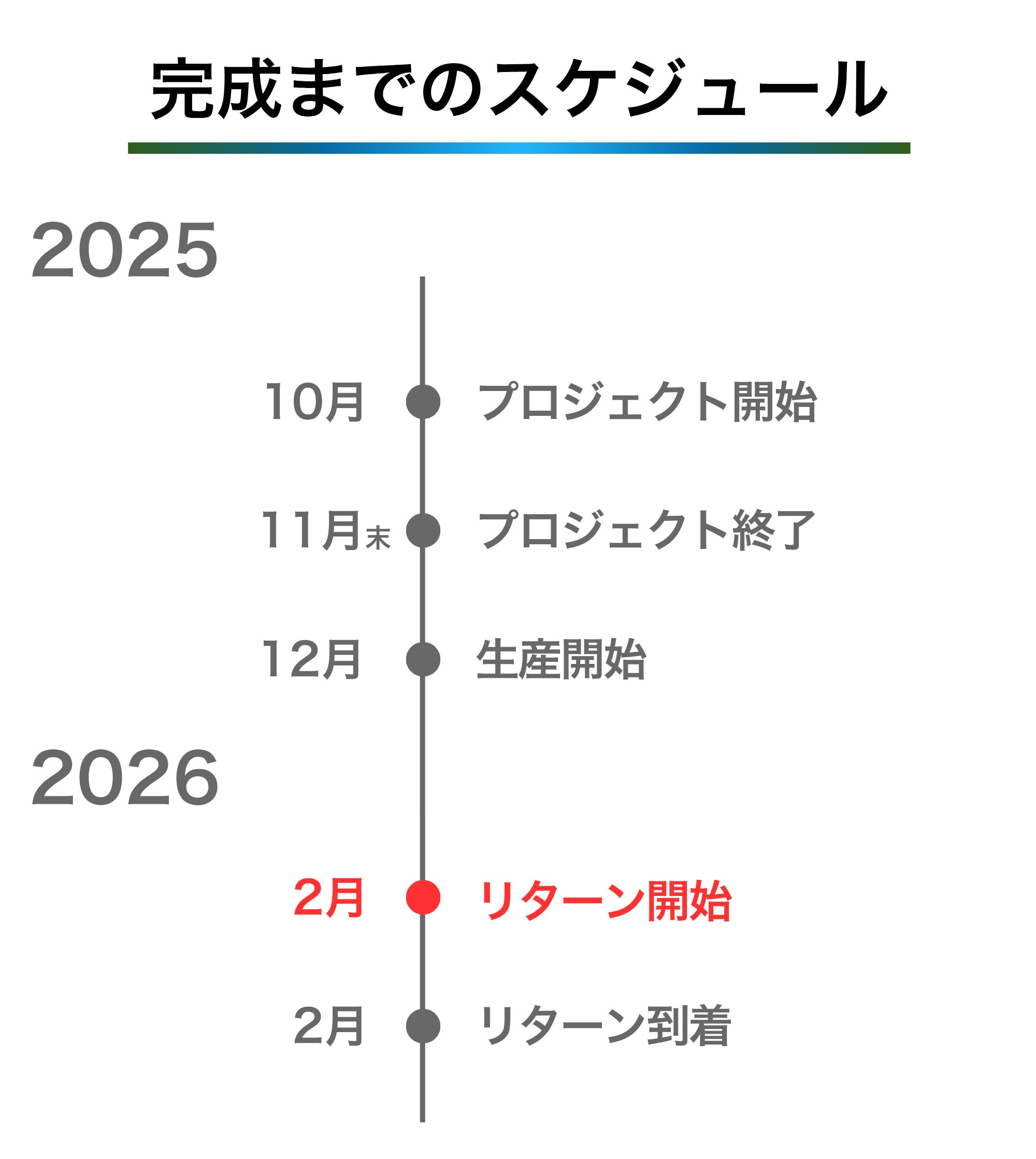 ※本文中に記載させていただいたスケジュールは、あくまでプロジェクト公開時点の予定です。クラウドファンディングを経て輸入を行う性質上、配送遅延のおそれがございます。