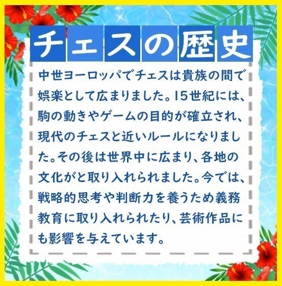- 世界中でチェスは「文化・教育・競技」の3側面で発展し続けています。