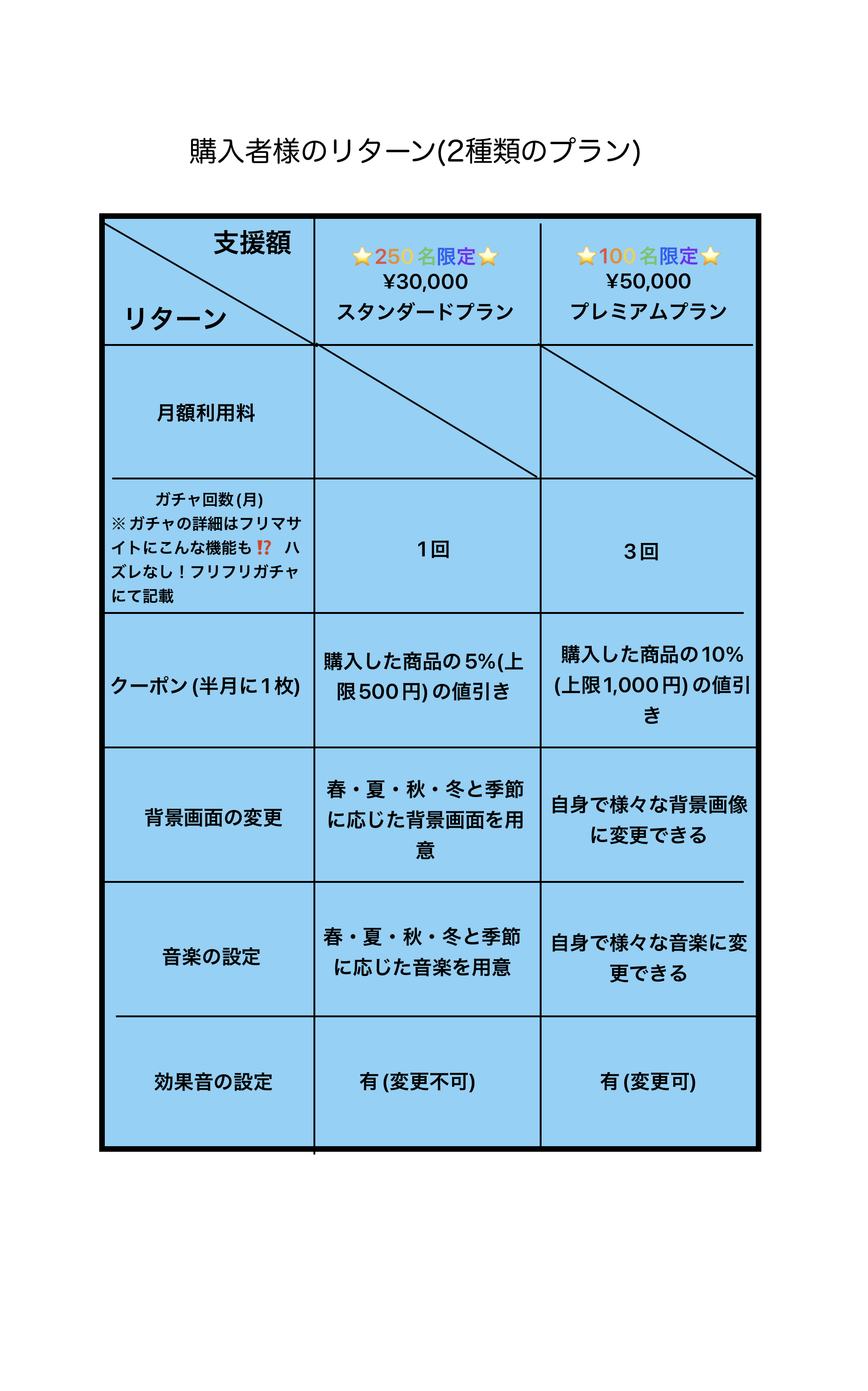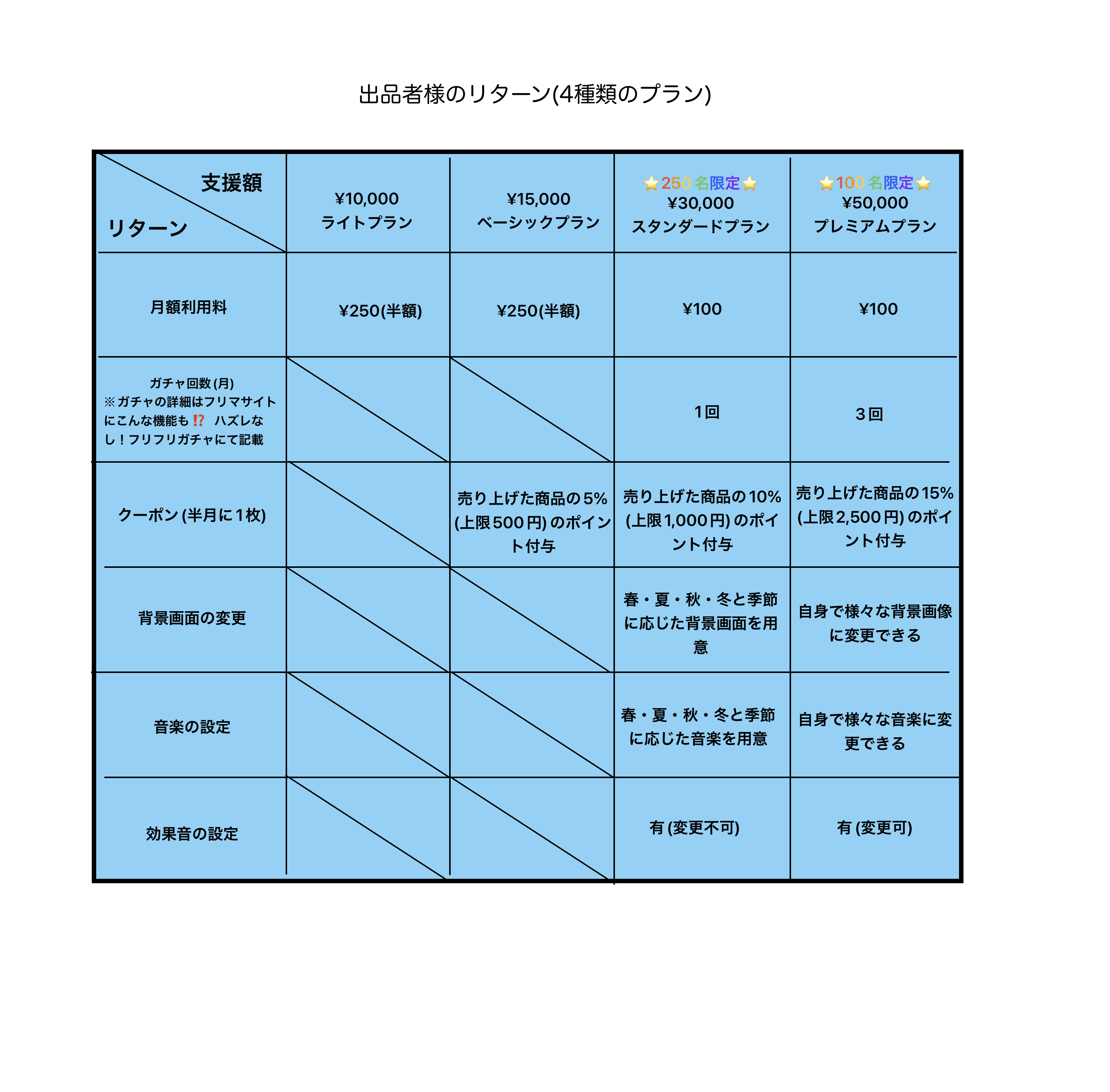 ・出品者様と購入者様とで、プランを分けております。お間違いのないよう、ご確認の上ご支援していただけたらと存じます。