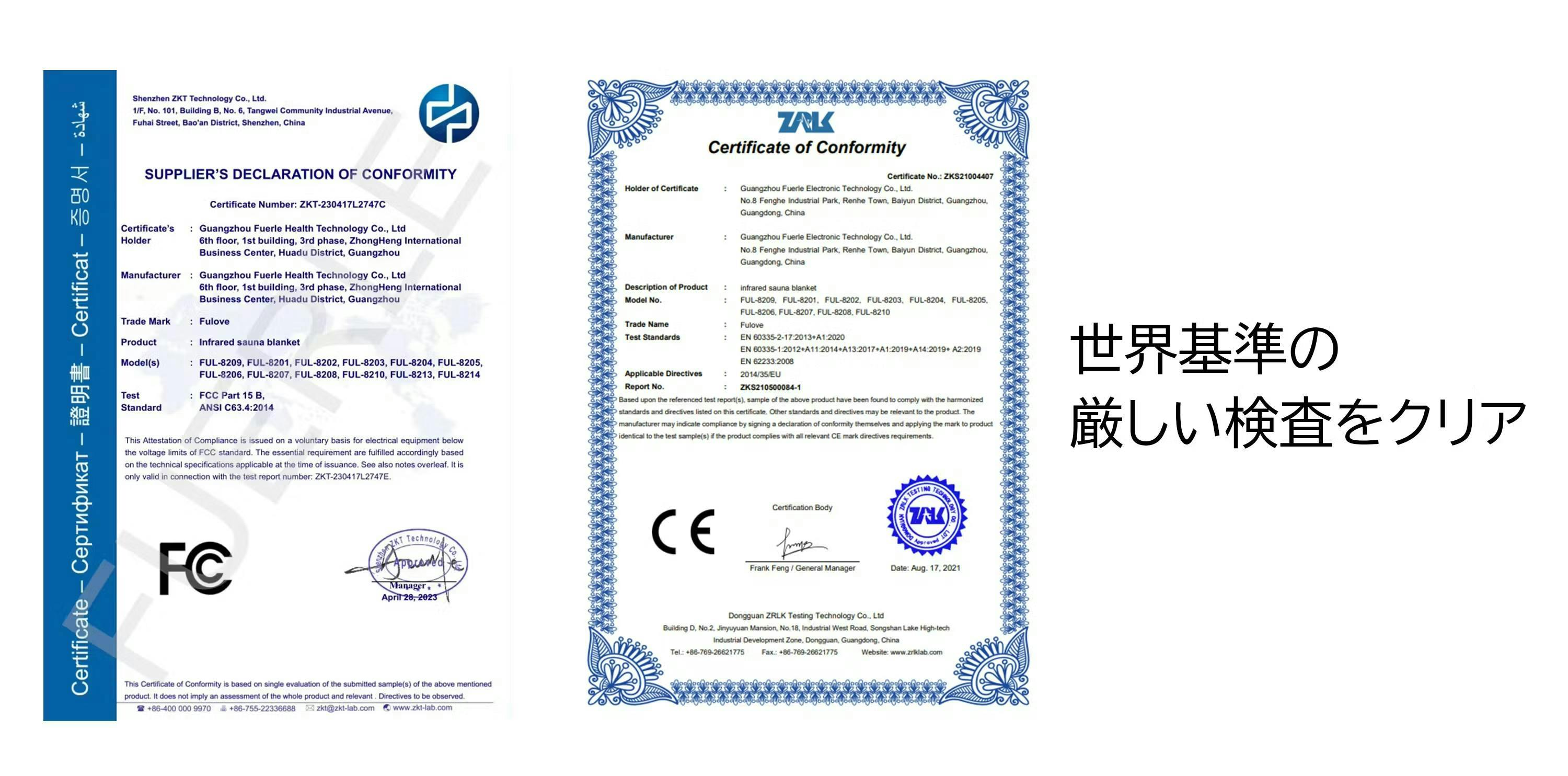 本製品は、世界基準の厳しい検査をクリアした証として CE認証 と FCC認証 を取得しています。CE認証は、ヨーロッパ連合(EU)が定める電気安全・電磁環境・健康への影響などの基準をすべて満たした製品にのみ付与されるものです。