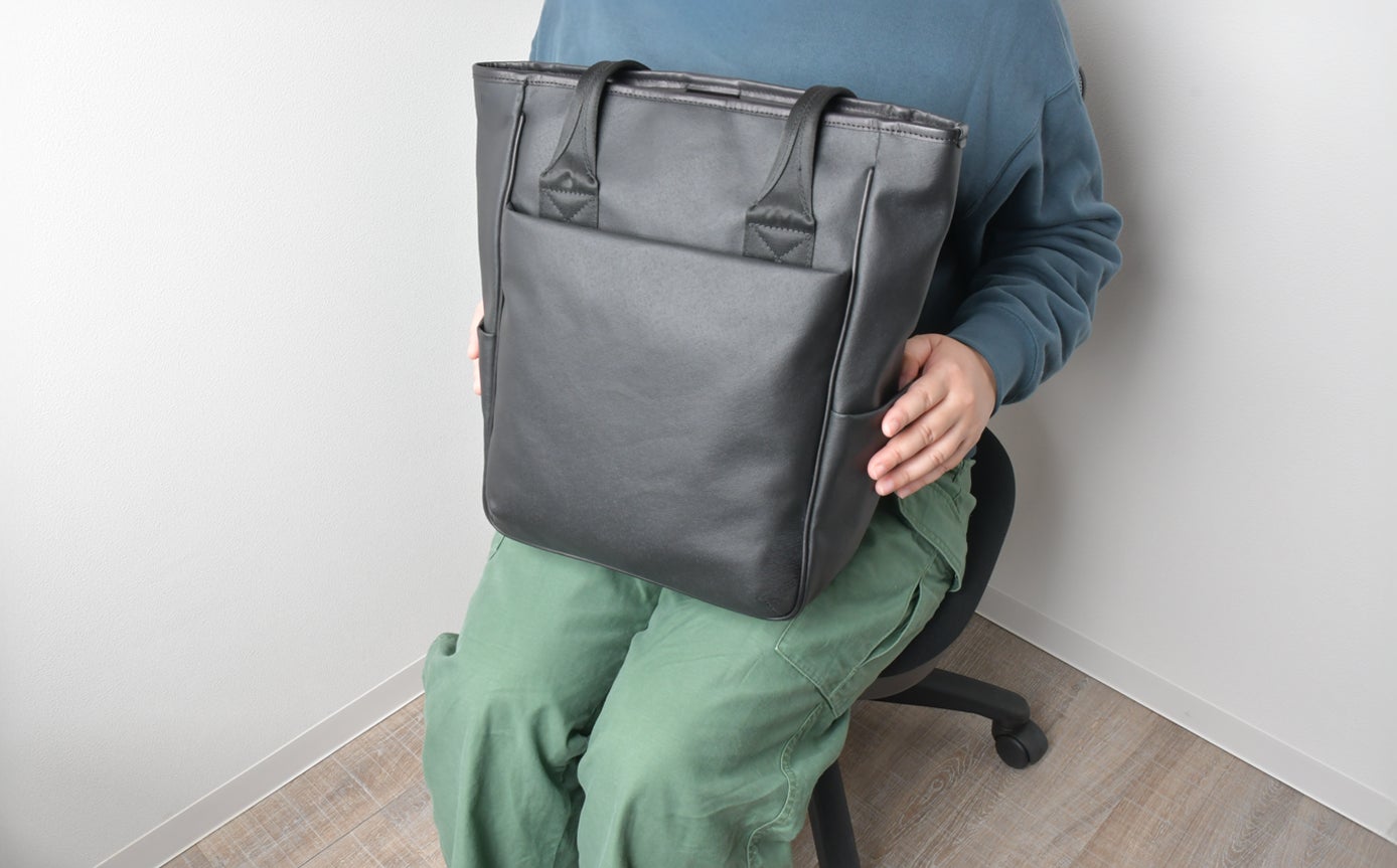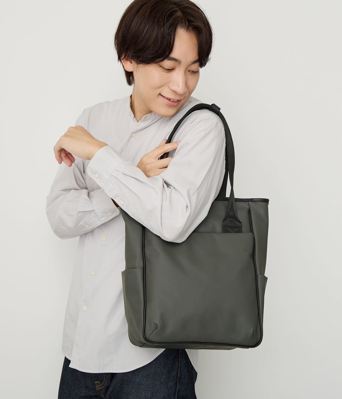 TOUGH NARROW TOTEはスリムな縦型設計だから、座ったときや立ったときにも隣の人にぶつかりにくく、視覚的にもスッキリ見えます。