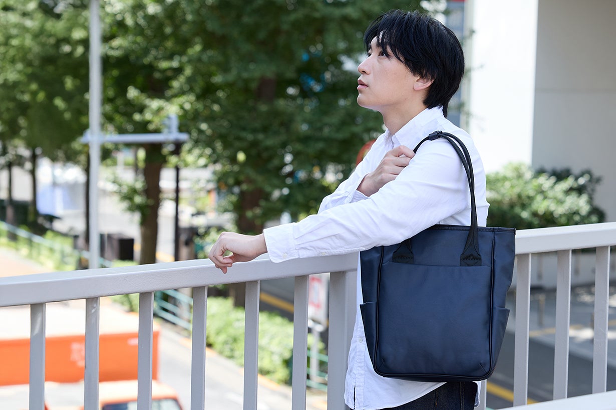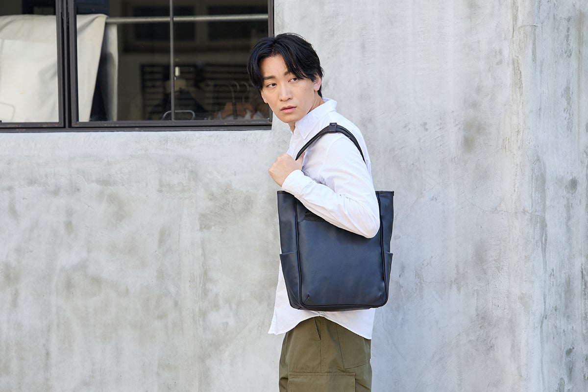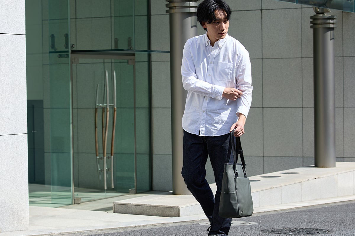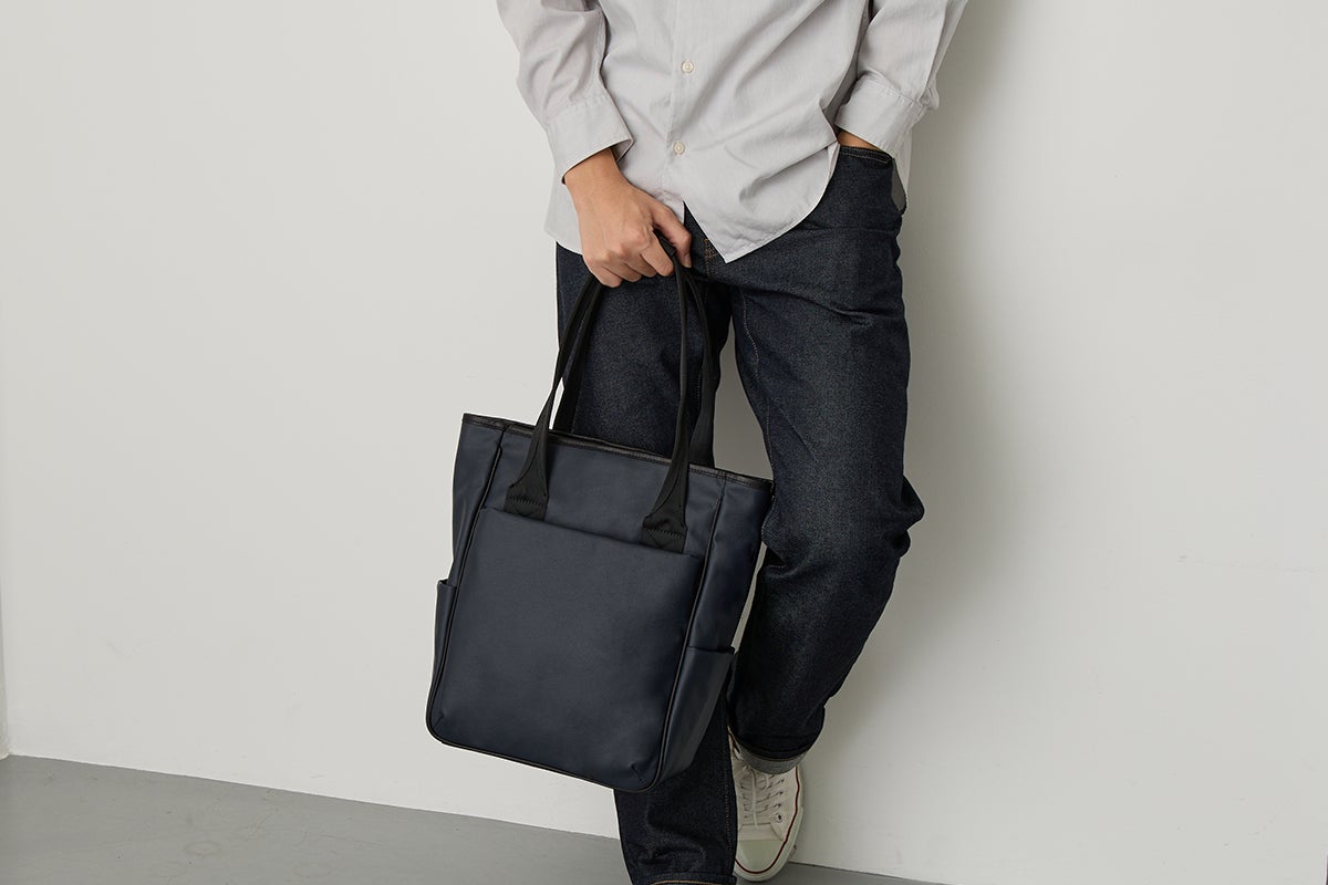 TOUGH NARROW TOTEは、ビジネスの必需品を無理なく収納し、オフィスカジュアルにも自然に馴染むミニマルなデザインで毎日の通勤にも活躍します。