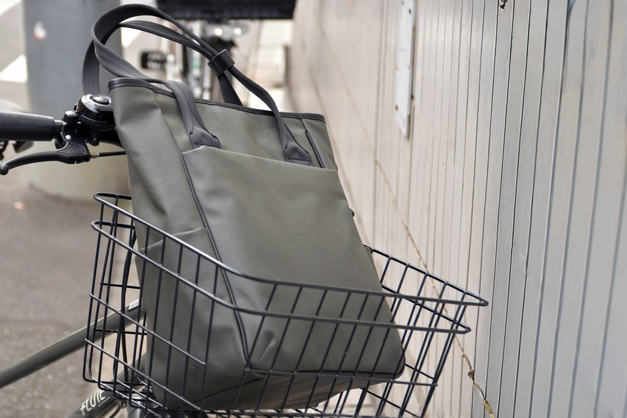 横幅を26cmに抑えた縦型トートにすることで、一般的な自転車の前カゴにもすっぽり入る設計に。