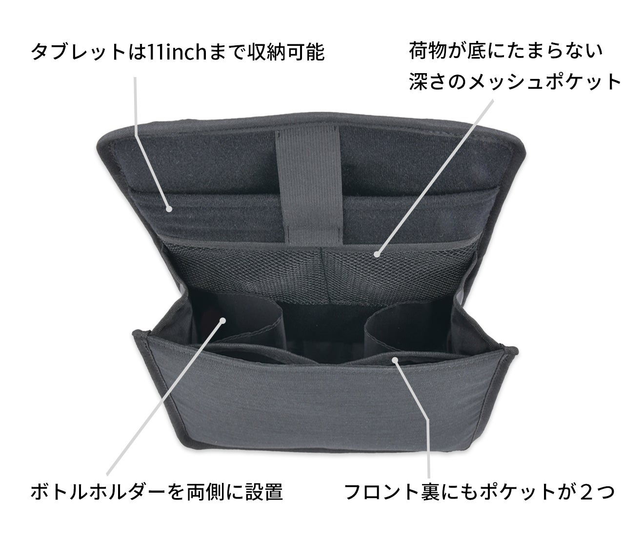 専用バッグインバッグには、PCとタブレットの2台持ちにも対応可能できるように、クッション芯と起毛生地でタブレットをしっかり保護するポケットが付きます。