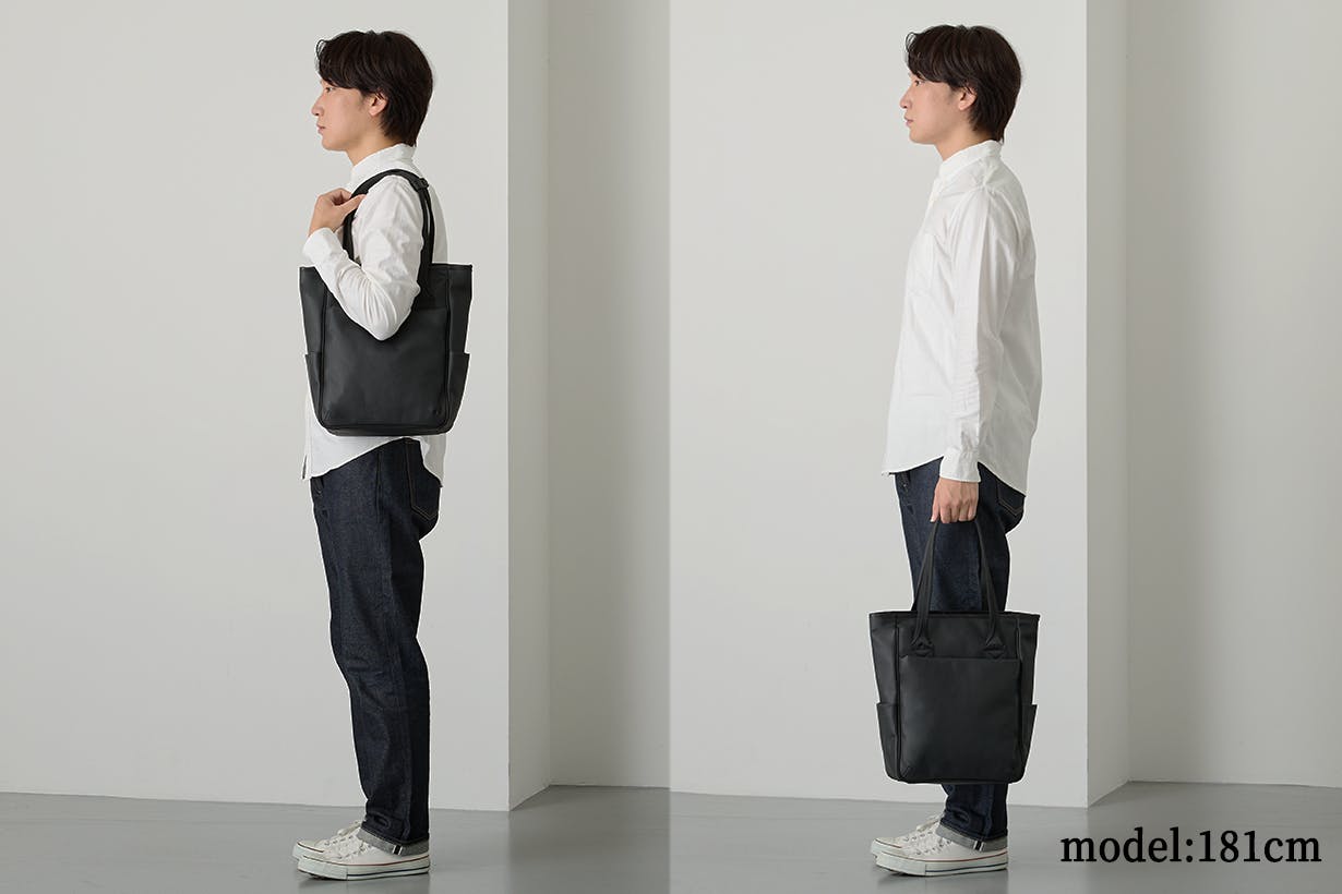 TOUGH NARROW TOTEはスリムな縦型設計だから、座ったときや立ったときにも隣の人にぶつかりにくく、視覚的にもスッキリ見えます。