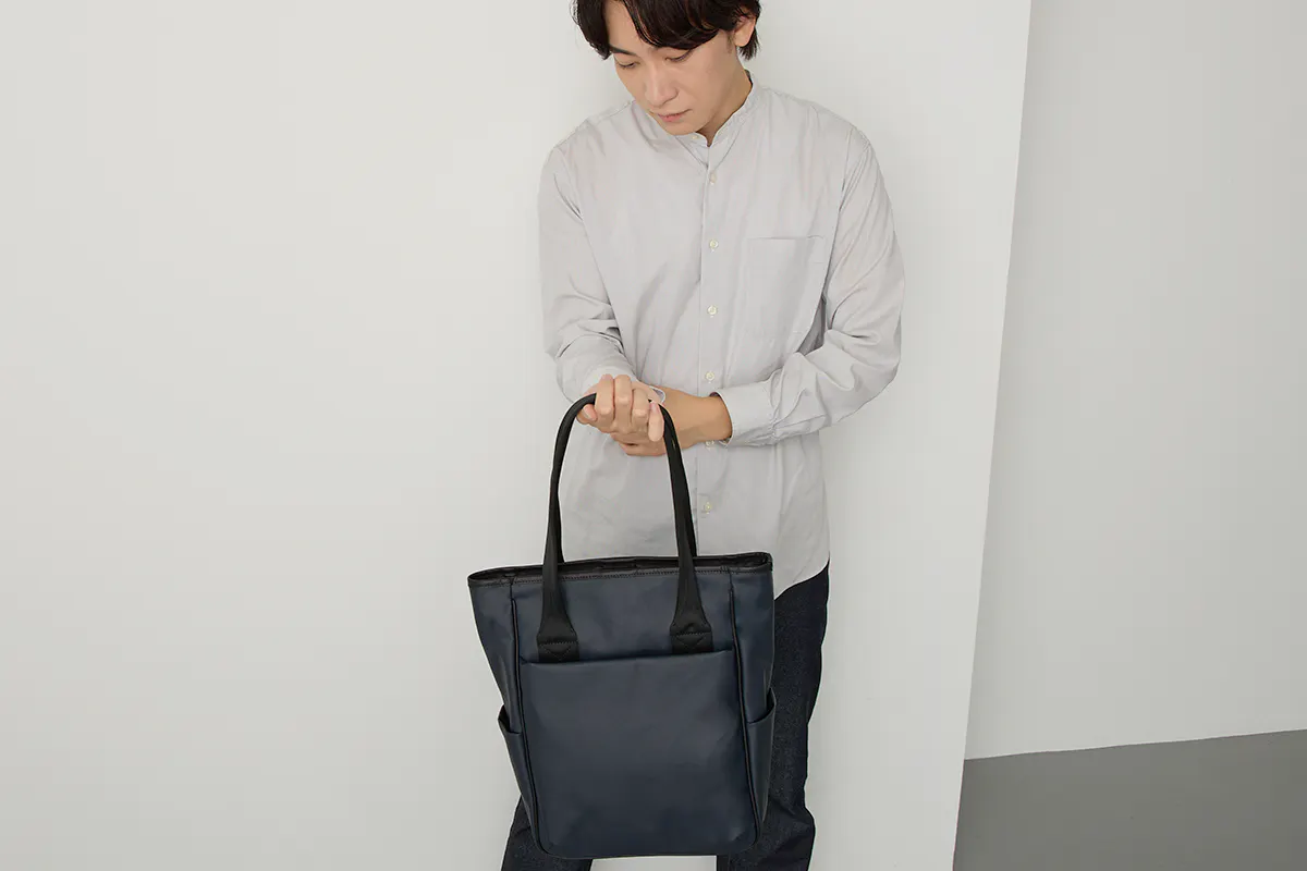 TOUGH NARROW TOTEは、ビジネスの必需品を無理なく収納し、オフィスカジュアルにも自然に馴染むミニマルなデザインで毎日の通勤にも活躍します。