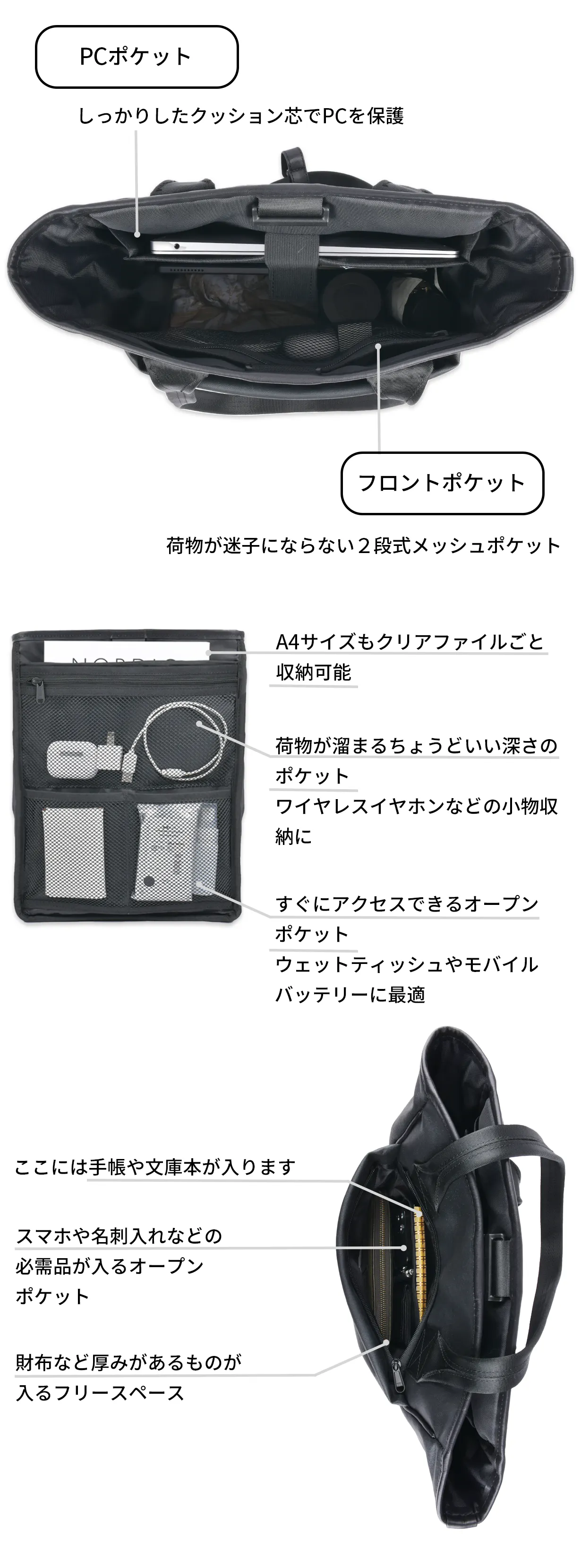 コンパクトなトートバッグなので、カフェなどで行うノマドワークにも最適です。