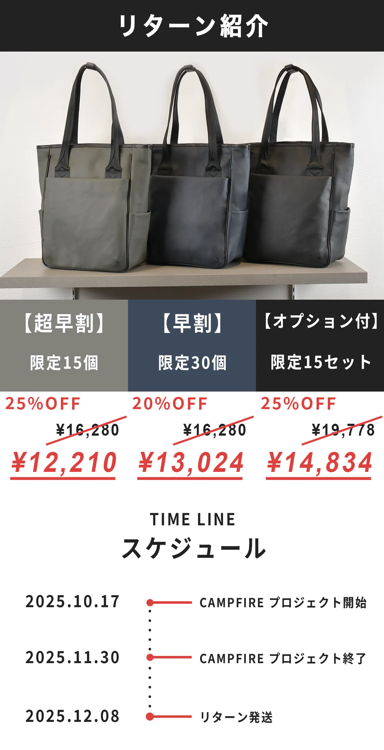 2025/11/27 18:30CAMPFIREユーザーの皆さまお世話になっております。TRIDEAL運営の千坂です。TOUGH NARROW TOTEのCAMPFIREでのプロジェクトも、とうとうラスト3日になりました。こちらのプロジェクトは、11/30 23:59に終了になります。全てのカラーで、一番お得にご購入できる【超早割】のリターンもまだ残っております。先に実施したMakuakeやmachi-yaのプロジェクトでは、本当に多くのご支援を集めた人気のプロダクトをぜひお得な価格でご購入ください。それでは最後までプロジェクトの応援とご支援よろしくお願いいたします。TRIDEAL 千坂 もっと見る