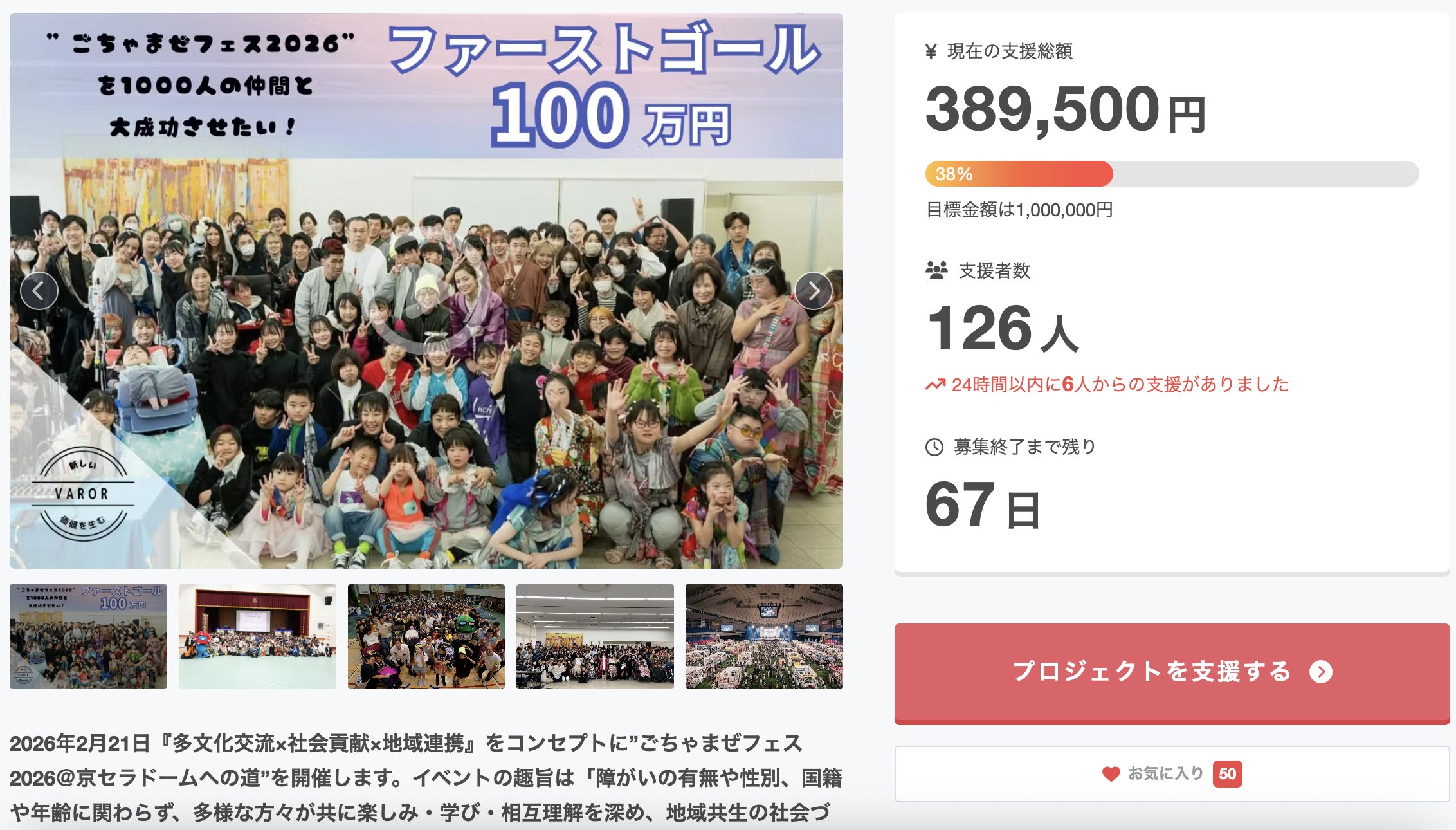 いつもお世話になっております。NPO法人VAROR代表理事の辻です。11月17日(月)19時からスタートしたクラウドファンディングですが1週間で「126名・389,000円」のご支援を頂きました。ご支援・ご協力いただいた皆様本当にありがとうございます。私たちが目指す「1000円×1000人」の目標まではまだまだ通過点…たくさんの方々の「笑顔」のために私たちは発信を続けます。クラウドファンディング終了の2026年1月31日まで様々な企画を準備していますので楽しみにお待ちください!引き続き皆様のご支援ご協力をお願い致します!