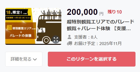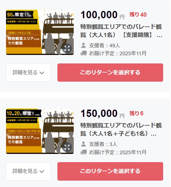 両リターン合わせると既に限定数の半数以上ご支援いただいています。少しでも前でゆったりと観覧されたい方、遠方から見に来られる方はぜひご検討ください。