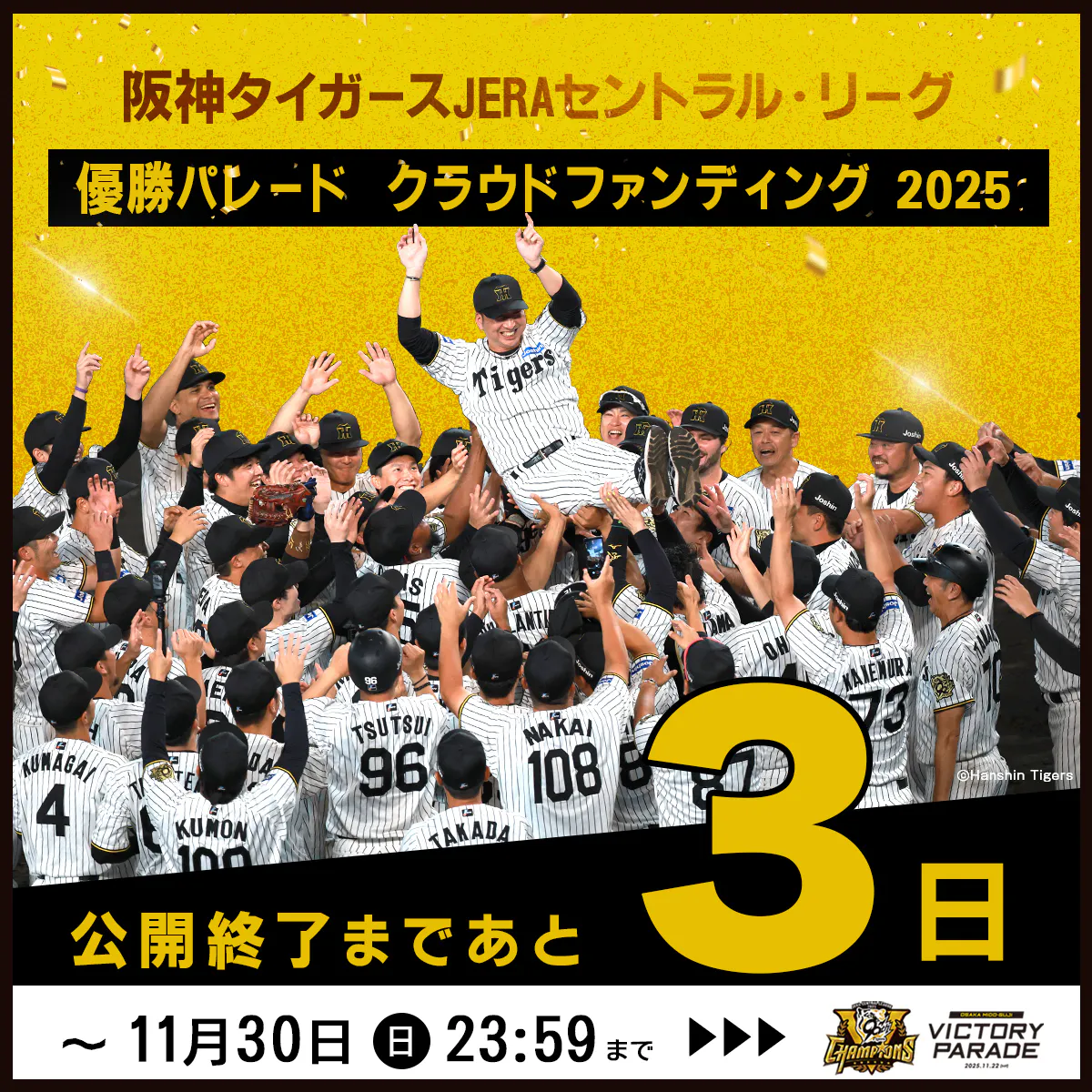 いつも温かいご支援をありがとうございます。10月18日(土)より支援受付を開始しました阪神タイガース優勝記念パレードのクラウドファンディングがあと3日で終了します!