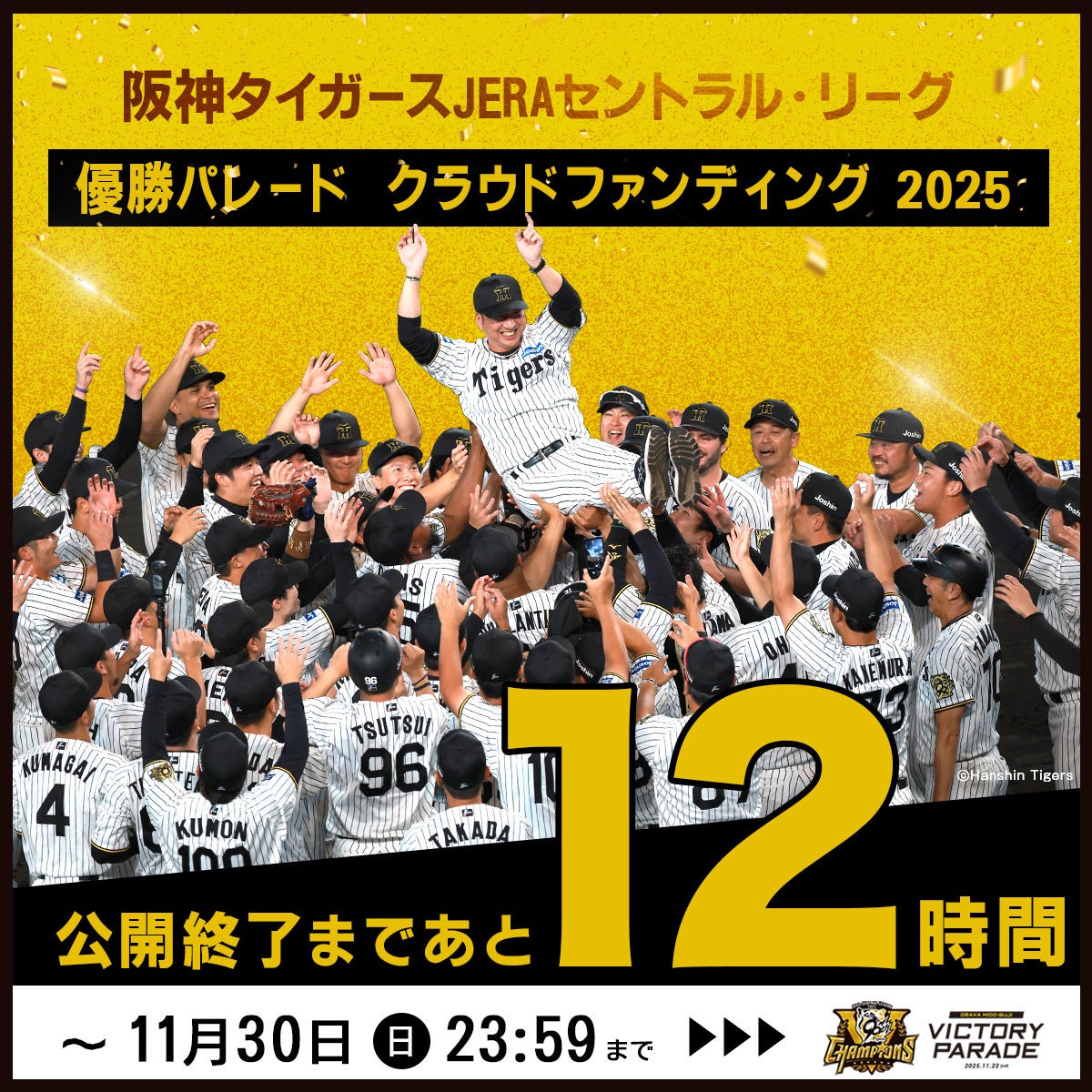 阪神タイガース優勝記念パレードのクラウドファンディングの支援終了まで残り12時間となりました。
