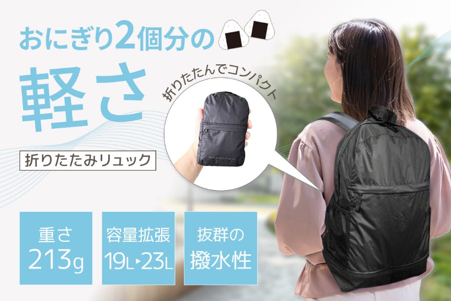 手のひらサイズに折りたためる。でも、23Lまで拡張できる。