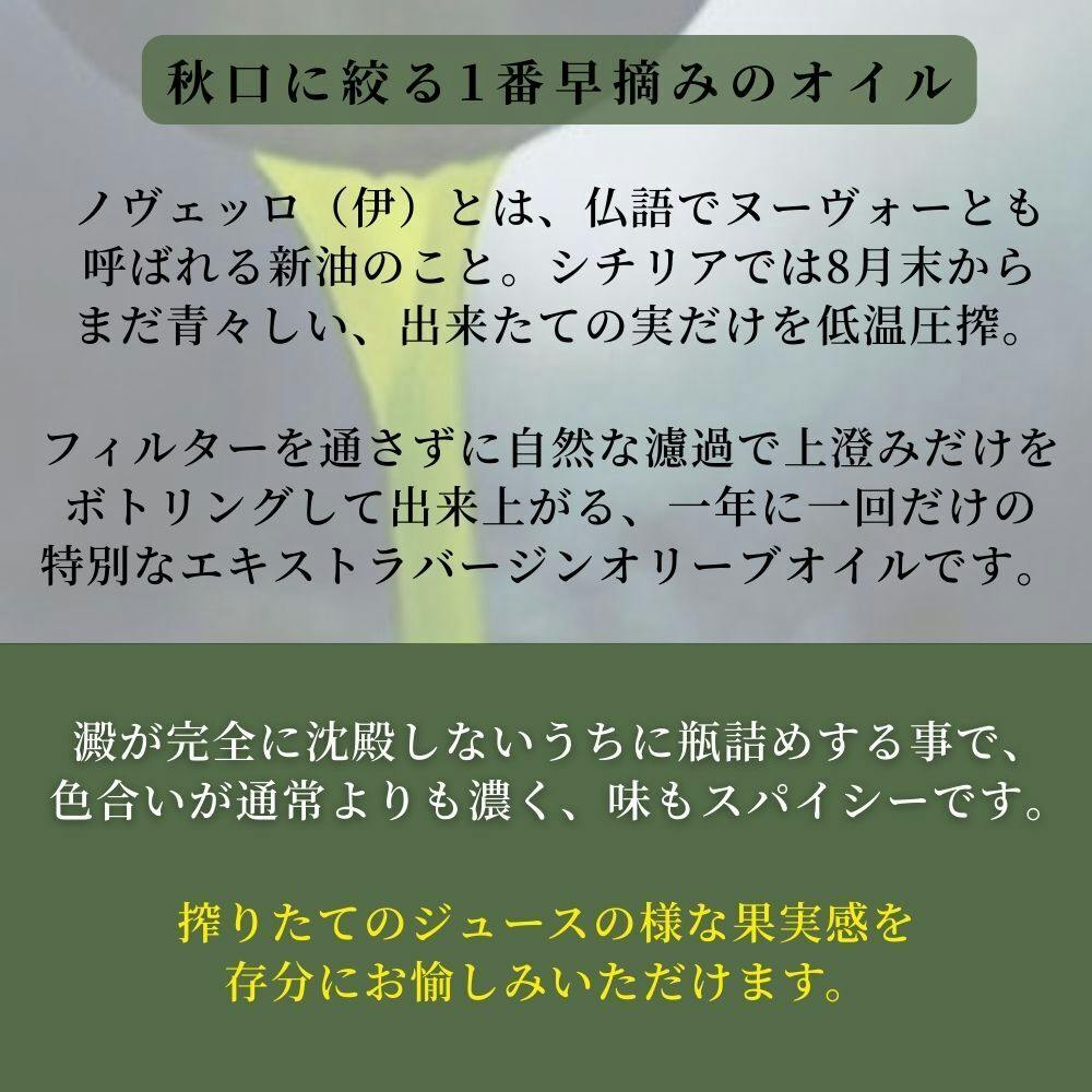 普通のオリーブオイルは濾過をするので。完全に実が取り除かれますが、ノヴェッロはノンフィルターですので、果実感がタップリなうえ、ポリフェノールがいっぱいです。また、今回セレクトした品種のモライオーロ種とビアンコリッラ種はマイルドなので、多くの日本人にも抵抗なく召し上がって頂けると考えています!ピッツァやパスタ、そしてパンにつけて沢山たべてください!
