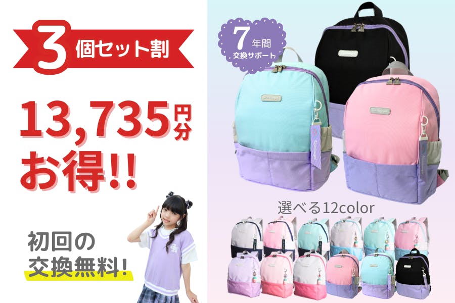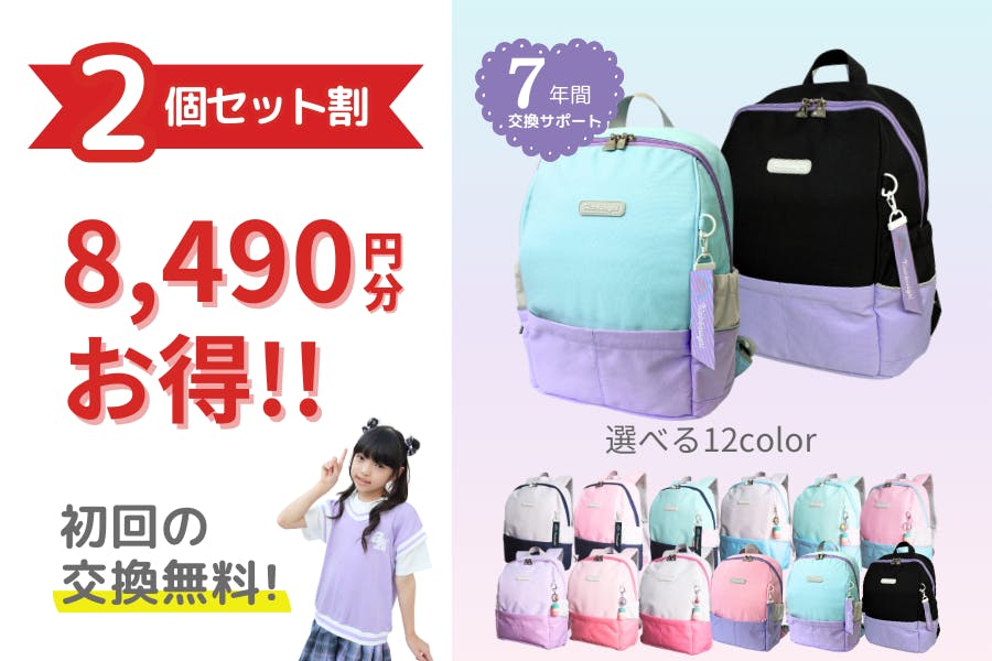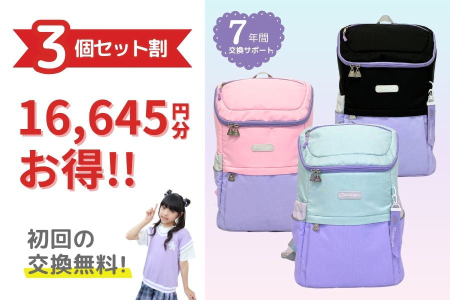 私たちが提案するのは、少ないご負担で、7年間、新品と交換できちゃう「7年間交換サポート」付きの通学リュックです。