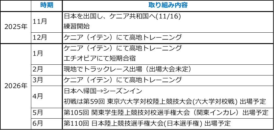 今期は大学を半期休学し、11月中旬に日本を出国。約4か月半のケニア遠征を経て、2026年4月以降は日本に帰国し、主要な大会できちんと結果を残すことを目指します。