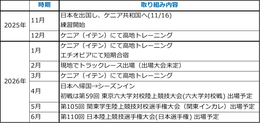 今期は大学を半期休学し、11月中旬に日本を出国。約4か月半のケニア遠征を経て、2026年4月以降は日本に帰国し、主要な大会できちんと結果を残すことを目指します。