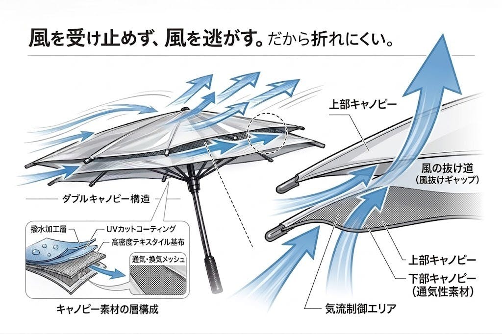 しかし私たちの傘はダブルキャノピー構造とグラスファイバー素材でそれを極限まで抑えています。