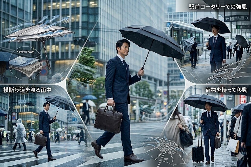ビルとビルの間の隙間風など、日常には突発的な強風というシチュエーションも少なくありません。そんな強風のたびに傘を追っていては365日使える傘とは言えません。