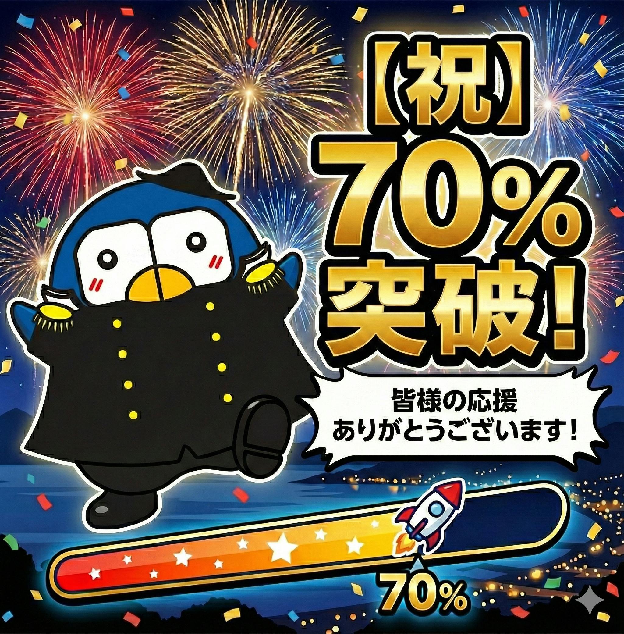 昨日から加速した皆さまの温かい応援により、なんと目標金額の70%を突破いたしました!予想を遥かに上回るスピードで集まる多くのご支援に、ぺるりんもますます張り切っています。