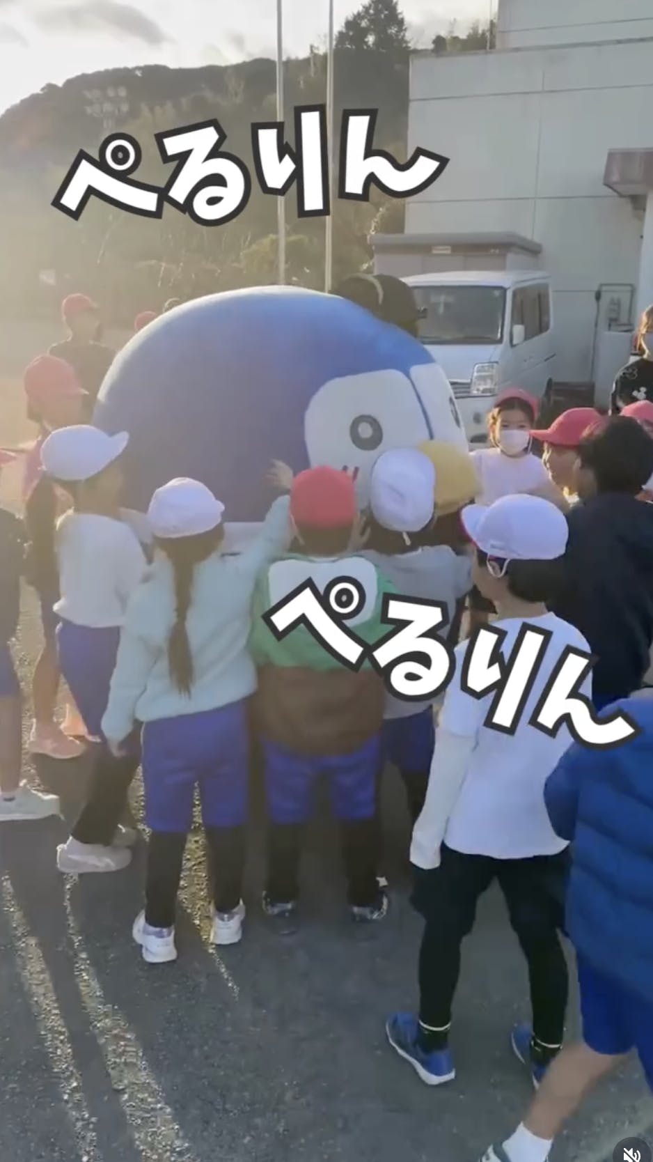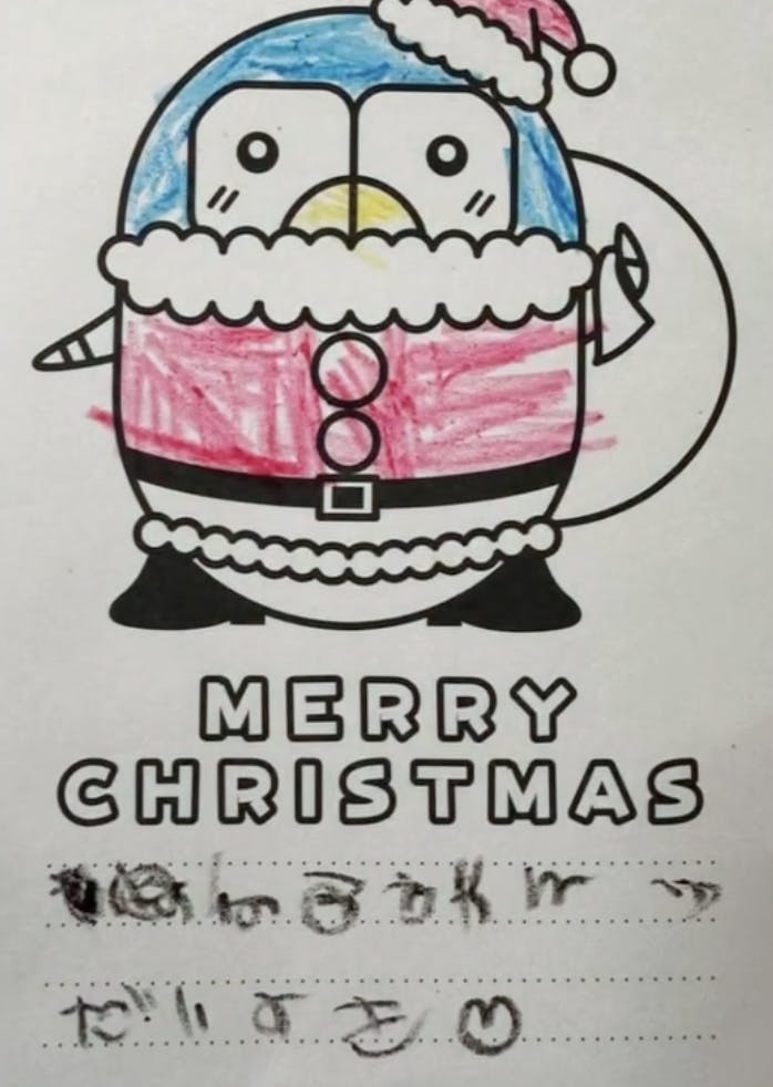 みんなで一緒に「ぺ〜るりん!」のかけ声と共に校舎の中を歩いたり、たくさんの子どもたちがぺるりんに抱きついてくれたり、プレゼントしたクリスマスカードの塗り絵を一生懸命に塗ってくれたり…