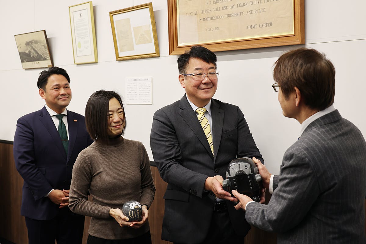 そのことを祝い、さらにクラウドファンディングの進捗報告も兼ねて、下田市役所へおもむき、リターン品であるぺるりん石像(見本品)を寄贈させて頂きました。
