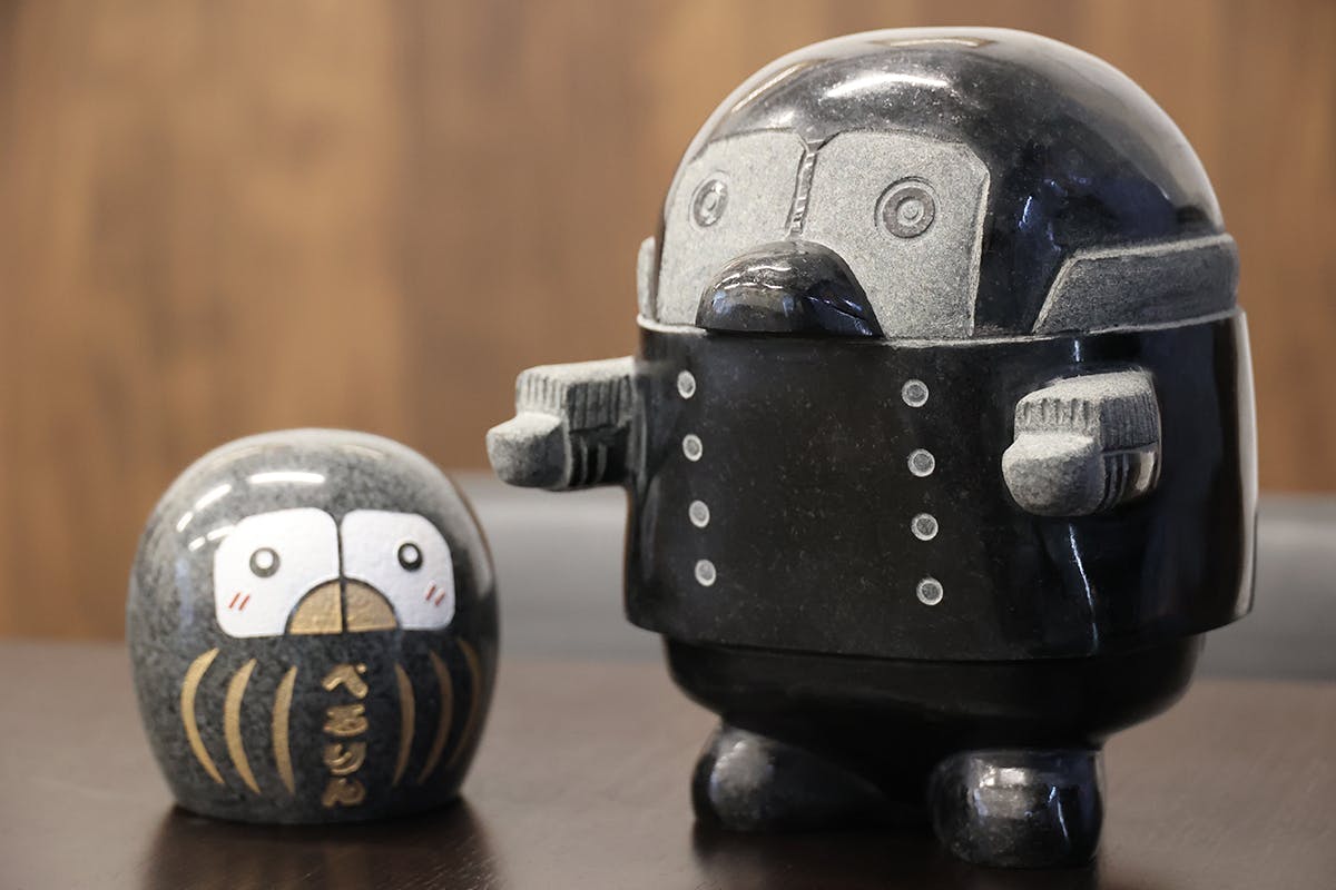 ぺるりん石像。手乗りだるま(左)は残数あり。黒船ペリーver.限定3体(右)は完売しました!