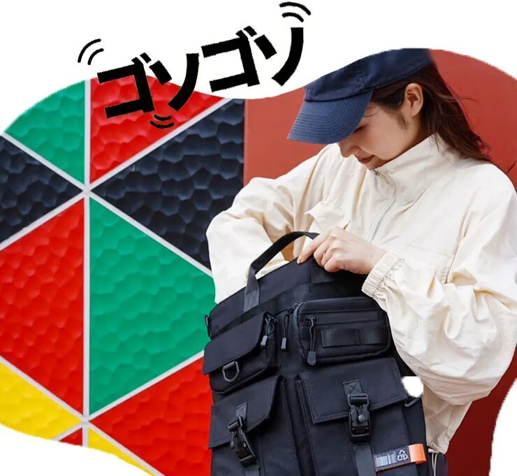 コンビニのレジや自販機の前で財布を取り出すためにリュックをくるっと前にまわし、荷物がたくさん入った中から財布を探すもなかなか見つからない。