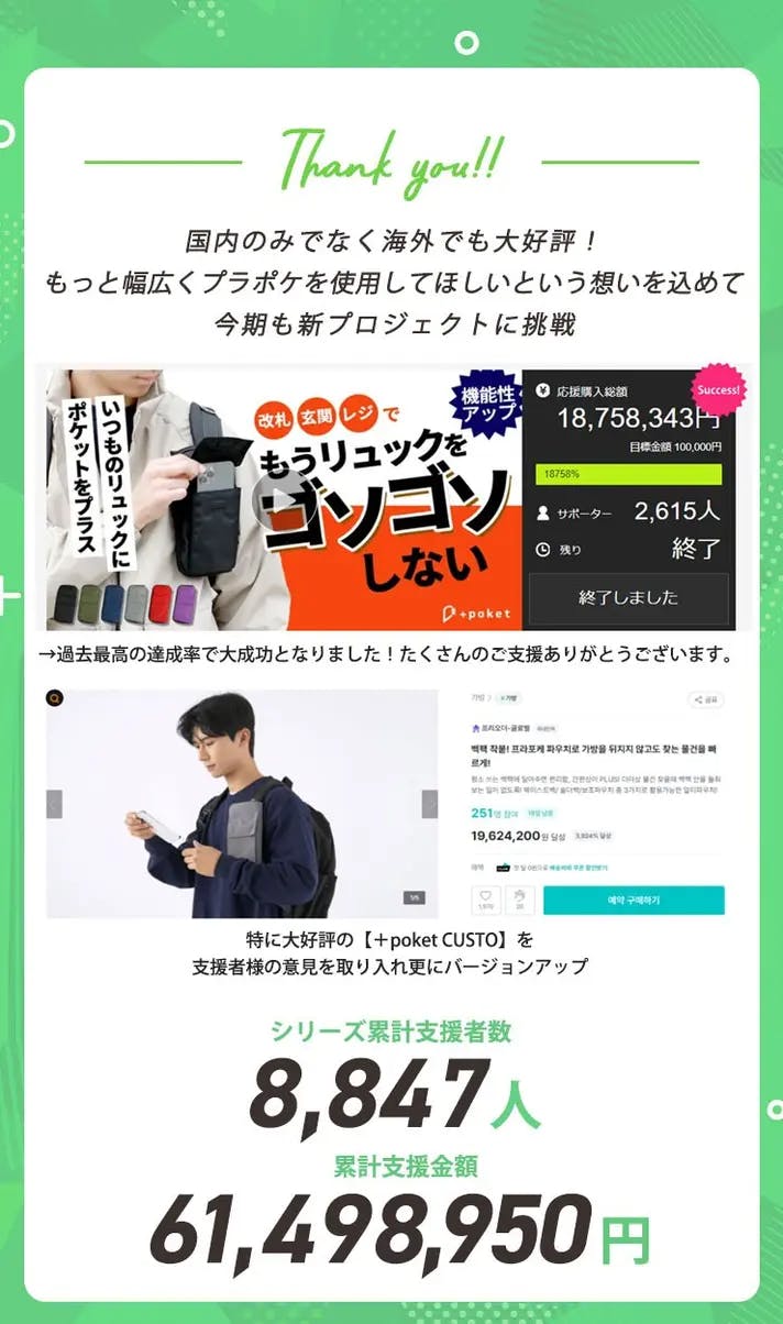 前回の【+poket】はとても大きな反響があり、最終的に海外での販売にもつながりサクセスすることができました。本当にありがとうございました。このように大きな反響があったことにより、国内外から多くの応援コメントや提案をいただくことができました。