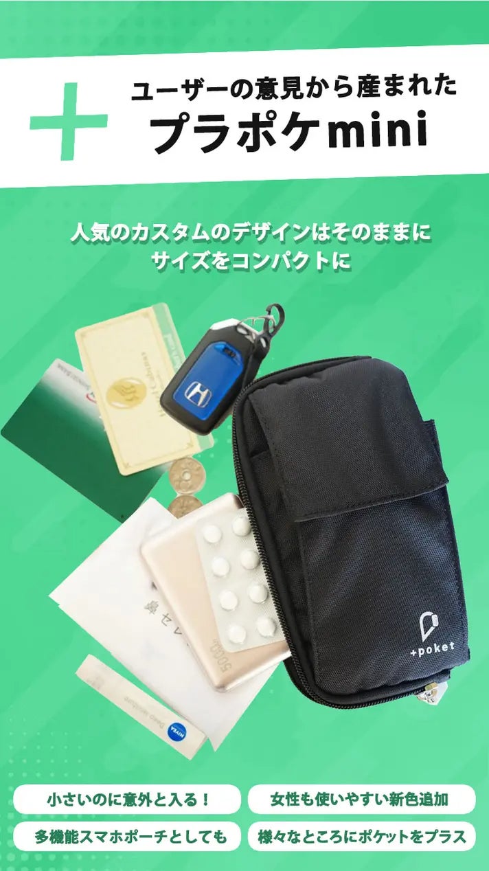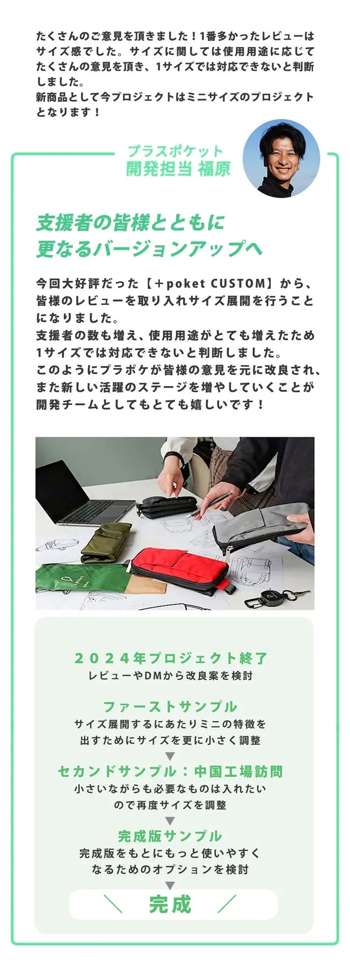 そしてそちらの意見を集約し今回第三弾となる【+poket mini】のプロジェクトに進むことができました。より多くの方とのつながりから細かい修正を加えられたと思っています。今後もこのアイデアを生かし、より大きなステージに挑戦していきたいと考えています。皆様と共に、本当に価値のあるアイテムを完成させられたらと思います。