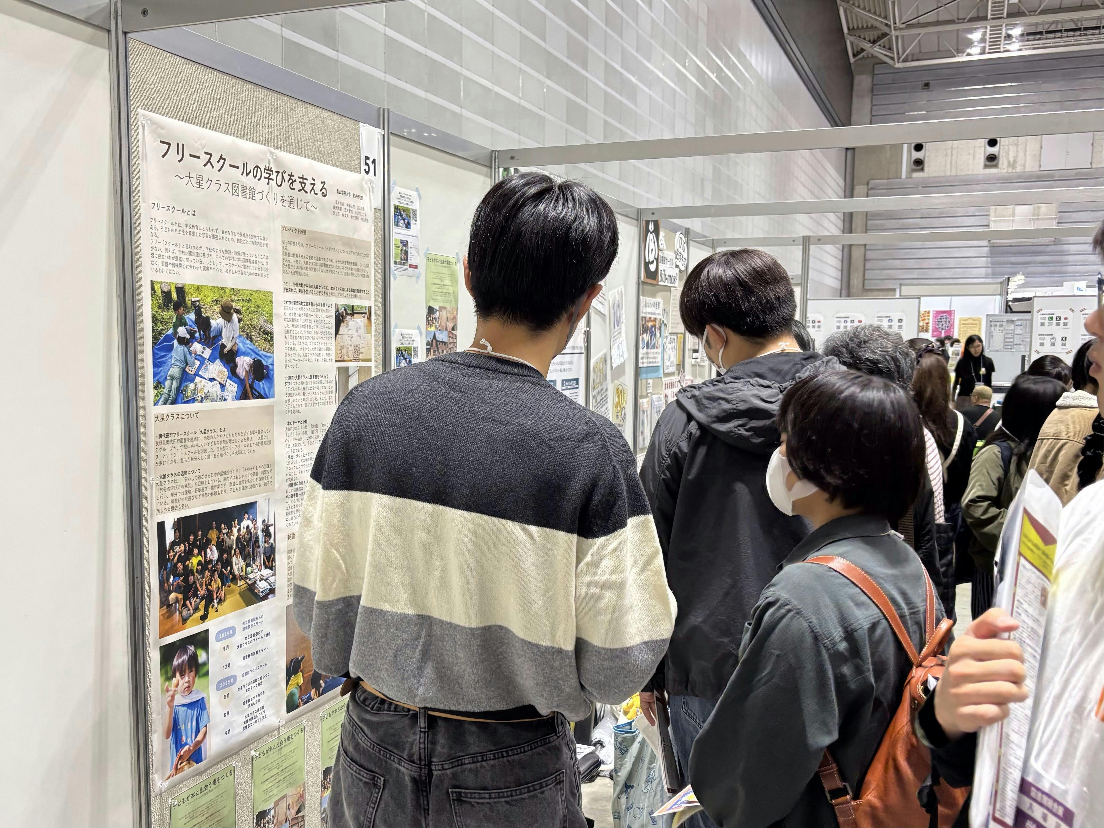 先週、横浜で開催された「図書館総合展」で、2年間取り組んできた本プロジェクトについてポスター展示を行い、来春卒業する4年生中心に発表報告をしてきました。彼ら個々の研究テーマは必ずしも「図書館」ではないのですが、これまで学んできたこと、子どもたちと一緒に手や体を動かしてきたことを、一所懸命言語化して伝えており、いただいた質問への回答も含め、よい学びの機会になったと感じています。