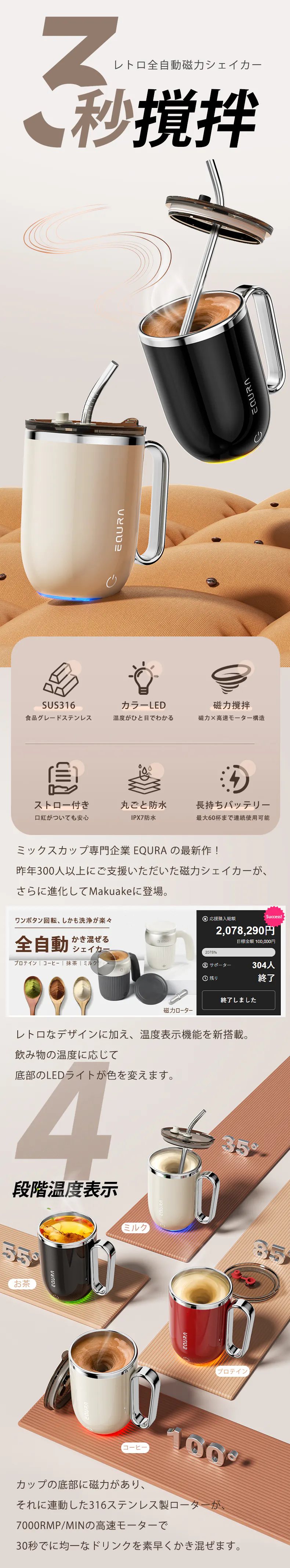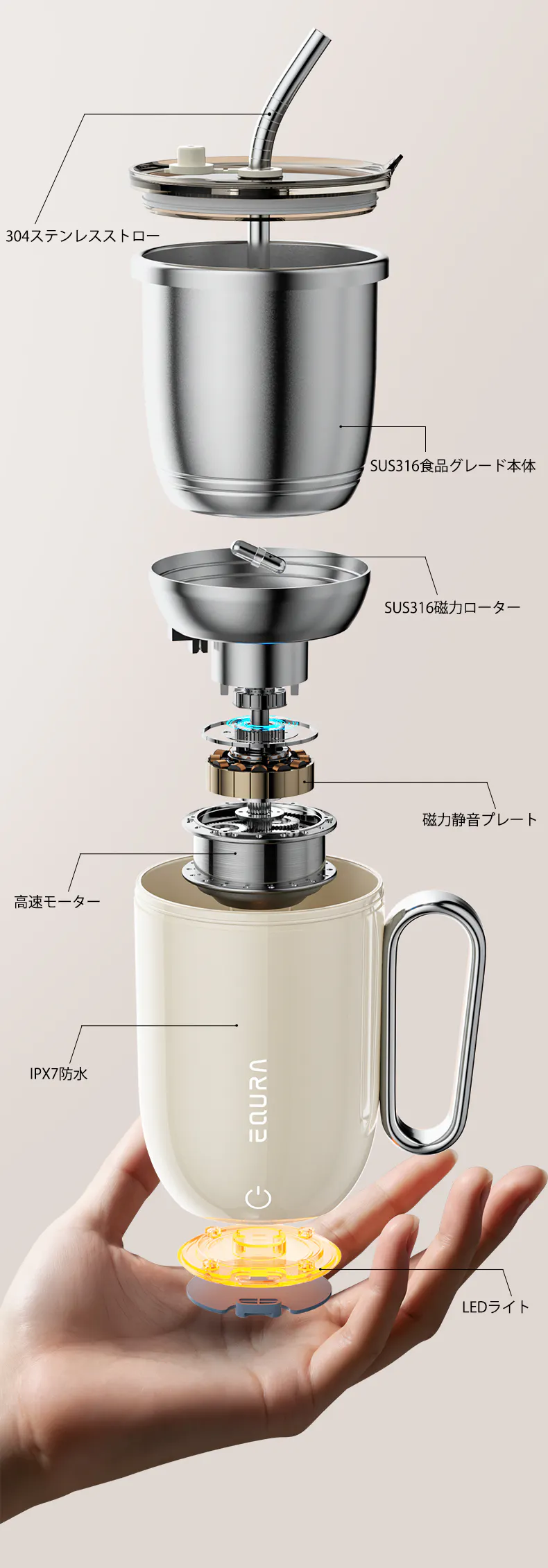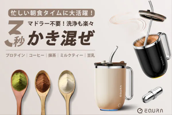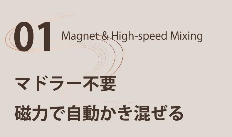 EQURAレトロ磁力シェイカーは、高速モーターと316ステンレス製磁力ローターを組み合わせた独自機構を搭載。毎分7000回転のパワーが生み出す渦が、水と粉末を一気に引き込み、わずか30秒でムラのない均一なドリンクを完成させます。