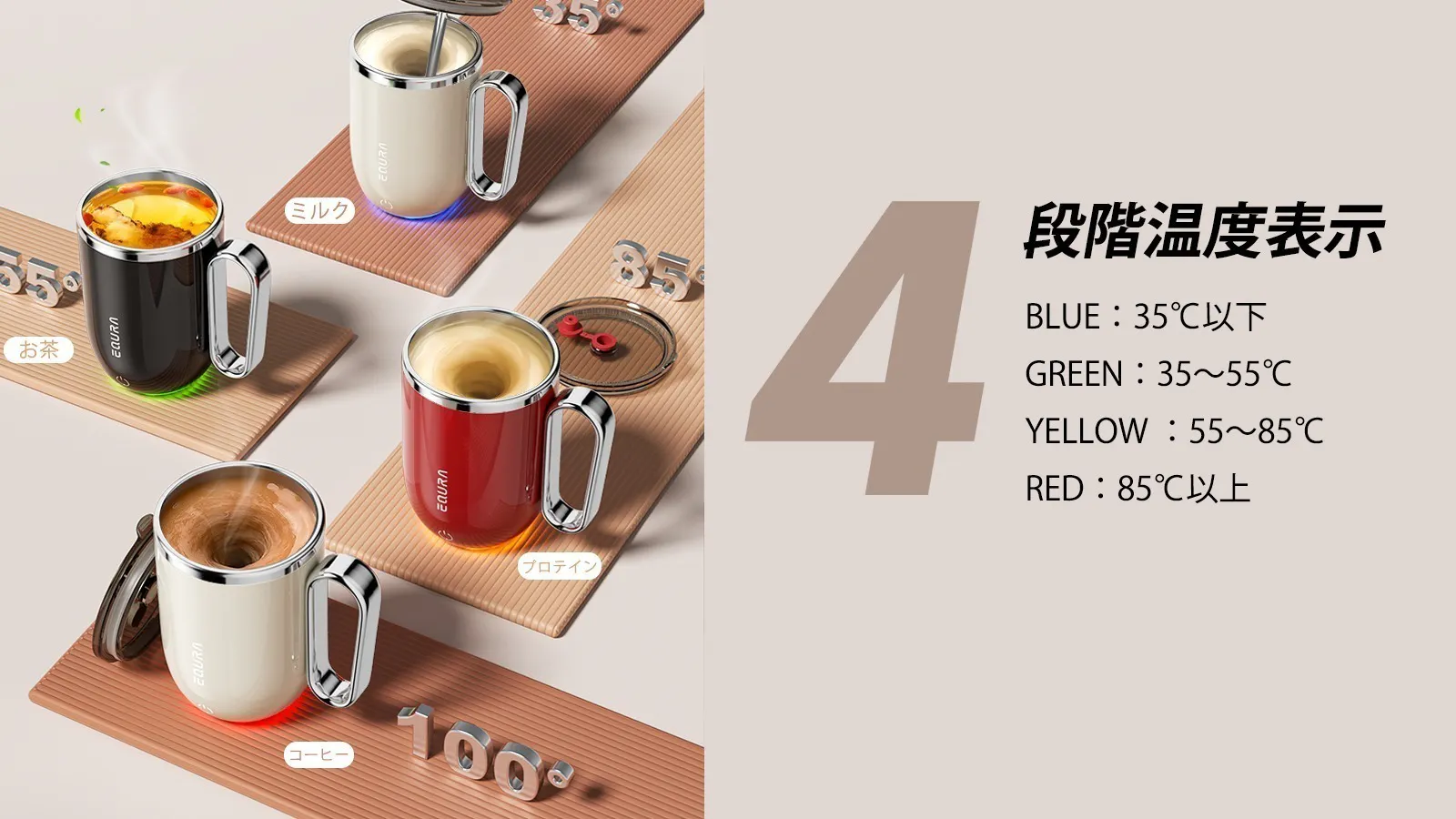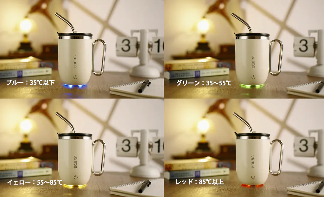 4色で、ひと目で最適な温度がわかります。熱すぎて飲めない失敗や、ぬるくなった残念感を防ぎ、ベストな温度でドリンクを楽しめます。