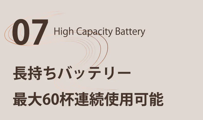 Type-C充電対応で、フル充電にはわずか1~1.5時間です。一度フル充電すれば、約60杯の飲み物を作ることができます。忙しい日常でも安心してお使いいただける長持ち設計です。