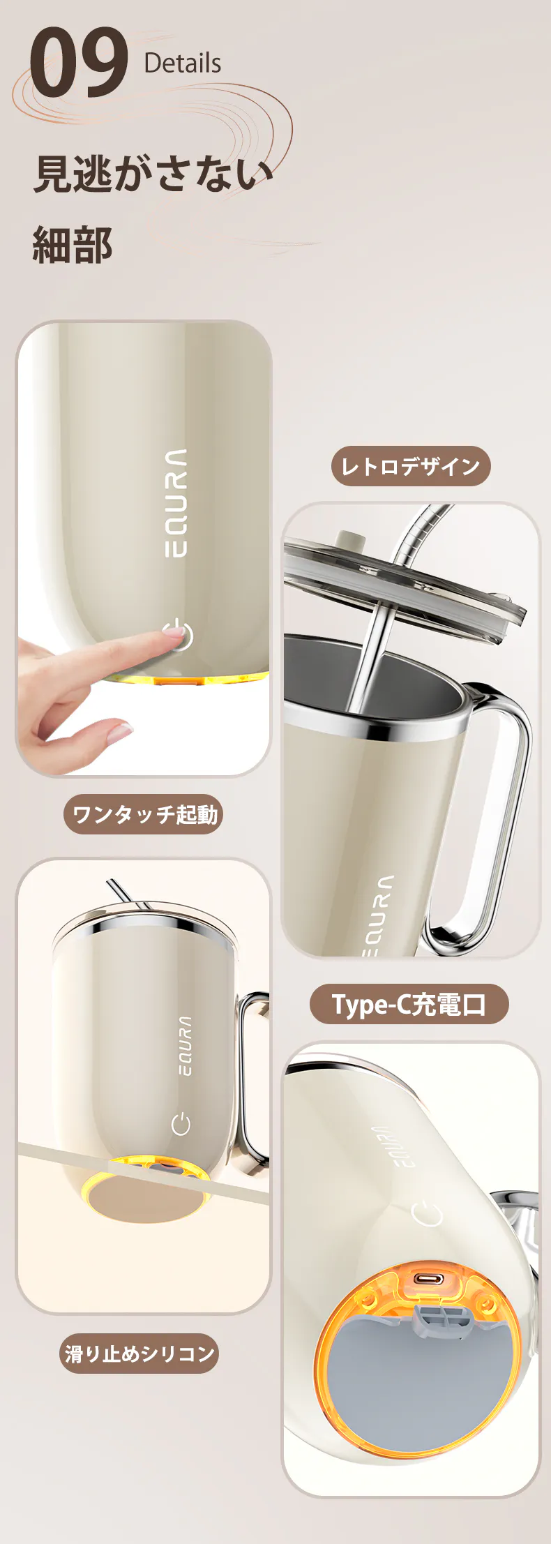 EQURA電動シェイカーは、懐かしい雰囲気のやわらかな曲線を描くレトロなフォルムで手に馴染みやすい。
