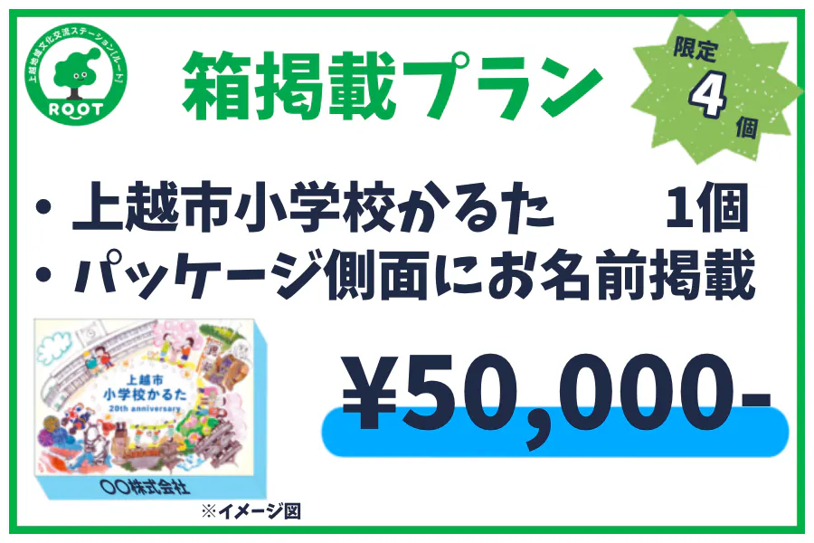 こちらのプランは、上越市小学校かるた1つと、かるたのパッケージ側面にご希望の名前やロゴを掲載する権利が付いているプランです。