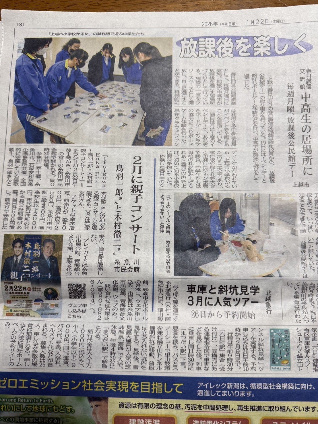 先日のかるた体験交流会の様子を、上越タイムスに取り上げていただきました!