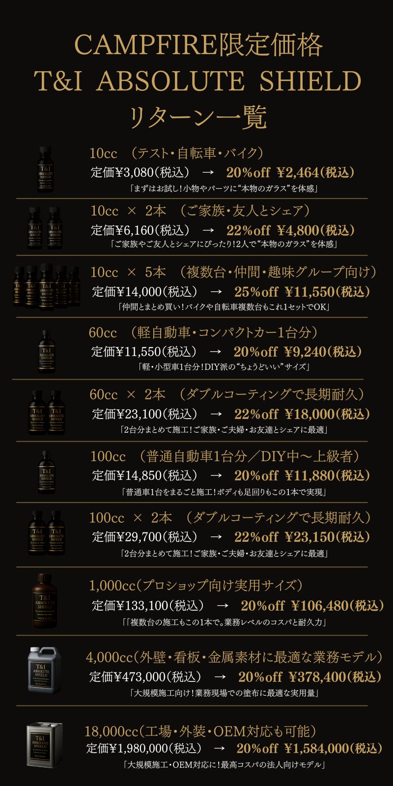 支援者の皆様には、内容量別に「T&I ABSOLUTE SHIELD」をお届けします。10cc(お試し用)から業務用18,000ccまで、幅広いニーズに対応したリターンを設定しています。すべて**CAMPFIRE限定価格(通常販売価格の約20%OFF)**でのご提供となります。