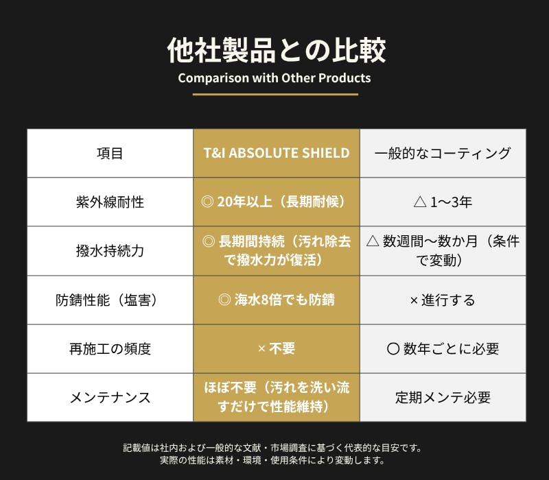 一般的なコーティングが数年で性能を失う中、T&I ABSOLUTE SHIELDは20年以上、圧倒的な耐久性能を維持。