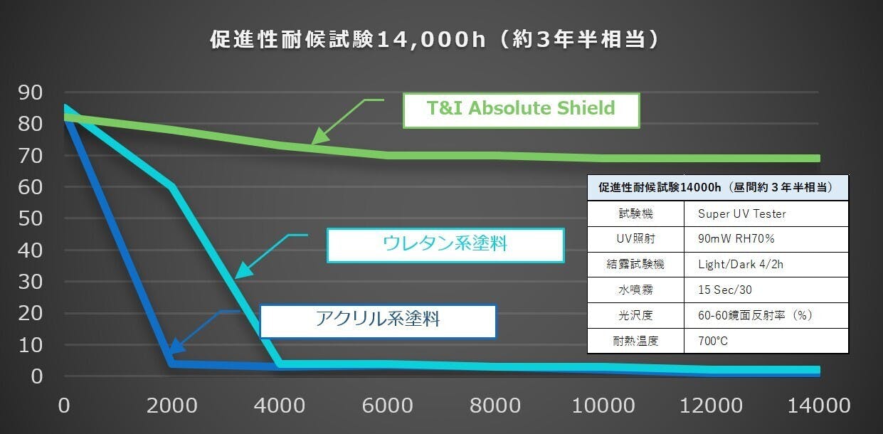 一般的なコーティングが数年で性能を失う中、T&I ABSOLUTE SHIELDは20年以上、圧倒的な耐久性能を維持。