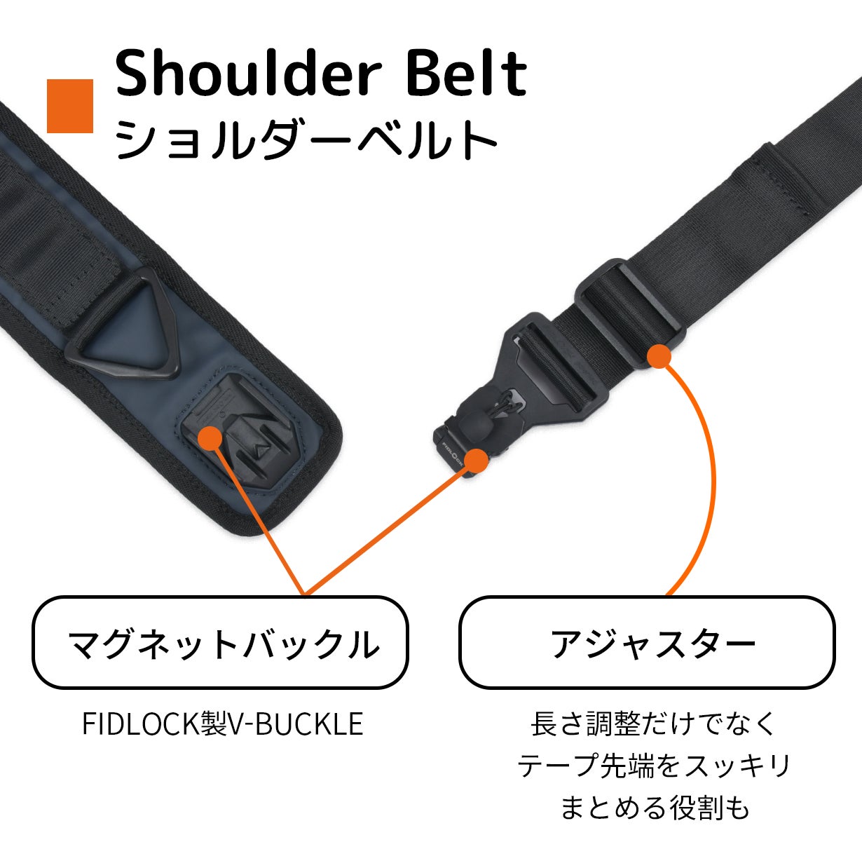 ショルダーベルトには、ドイツのパーツブランド【FIDLOCK】のマグネットバックルを使用しています。