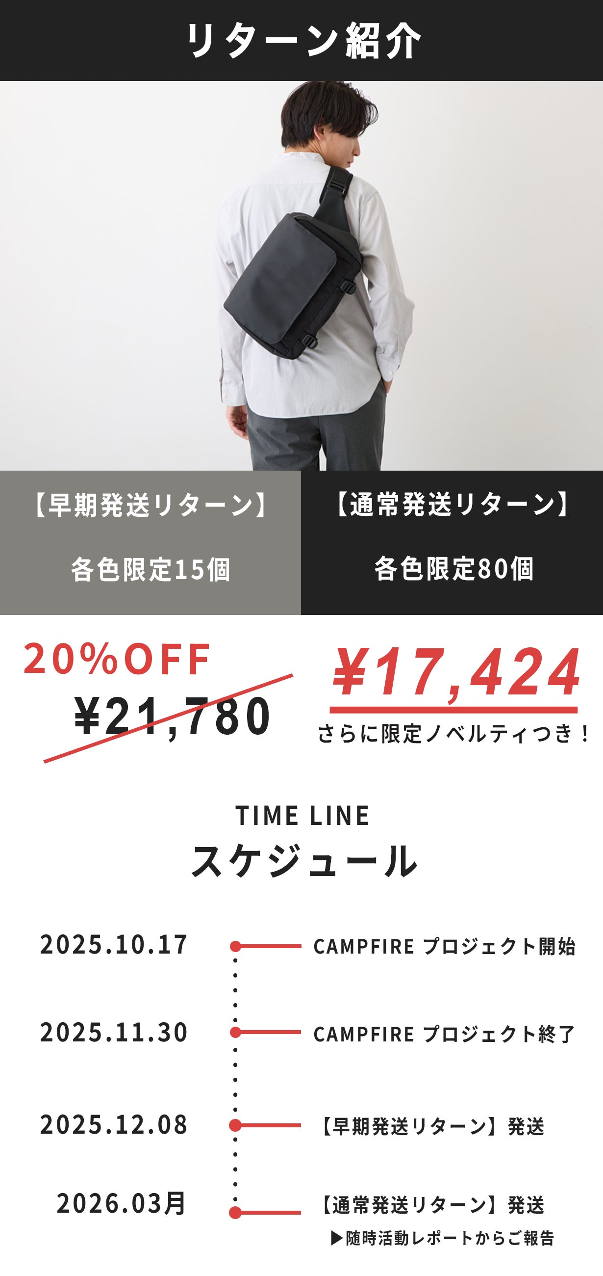 2025/11/27 18:00CAMPFIREユーザーの皆さまお世話になっております。TRIDEAL運営の千坂です。TOUGH BIG SLING BAGのCAMPFIREでのプロジェクトも、とうとうラスト3日になりました。こちらのプロジェクトは、11/30 23:59に終了になります。全てのカラーで、一番お得にご購入できる【超早割】のリターンもまだ残っております。これまで本当に多くの方からご購入いただいた人気のプロダクトに、CAMPFIRE限定のノベルティまでついたお得なプロジェクトですので、最後までご検討をお願いいたします。それでは最後までプロジェクトの応援とご支援よろしくお願いいたします。TRIDEAL 千坂 もっと見る