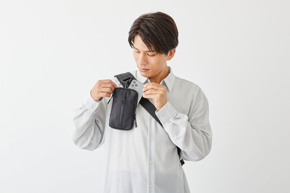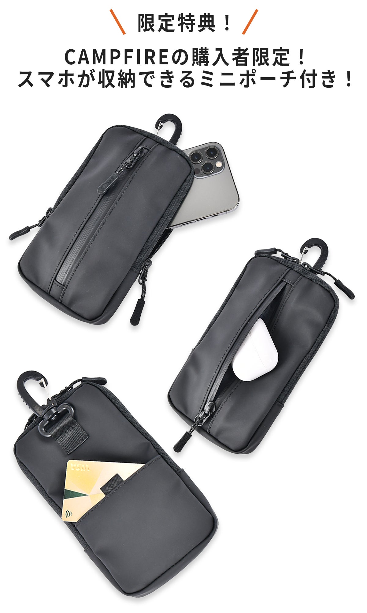 今回のCAMPFIREでのプロジェクトでは、スリングバッグをもっと便利に使えるスマホポーチを全ての購入者の方にご提供します!