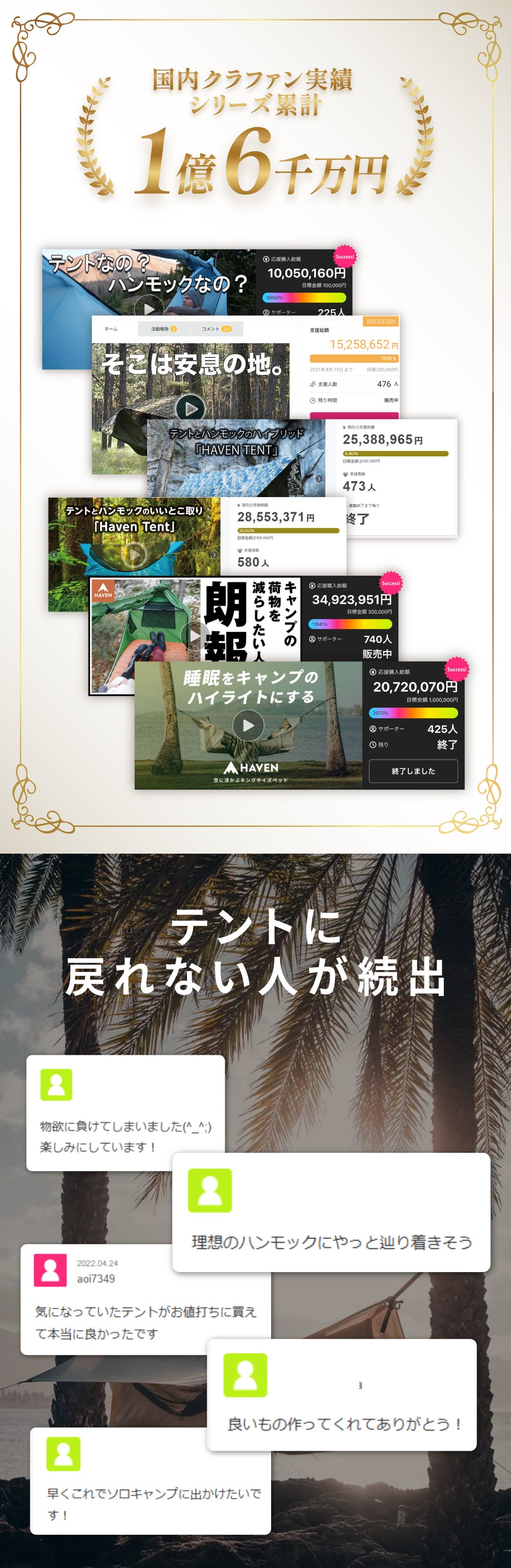 私たちと米国Haven Tent社は、ユーザーの皆さまをヘブンテントファミリーの一員と考えており、皆さまと一緒に成長していきたいと考えています。これからもどうぞよろしくお願いいたします。