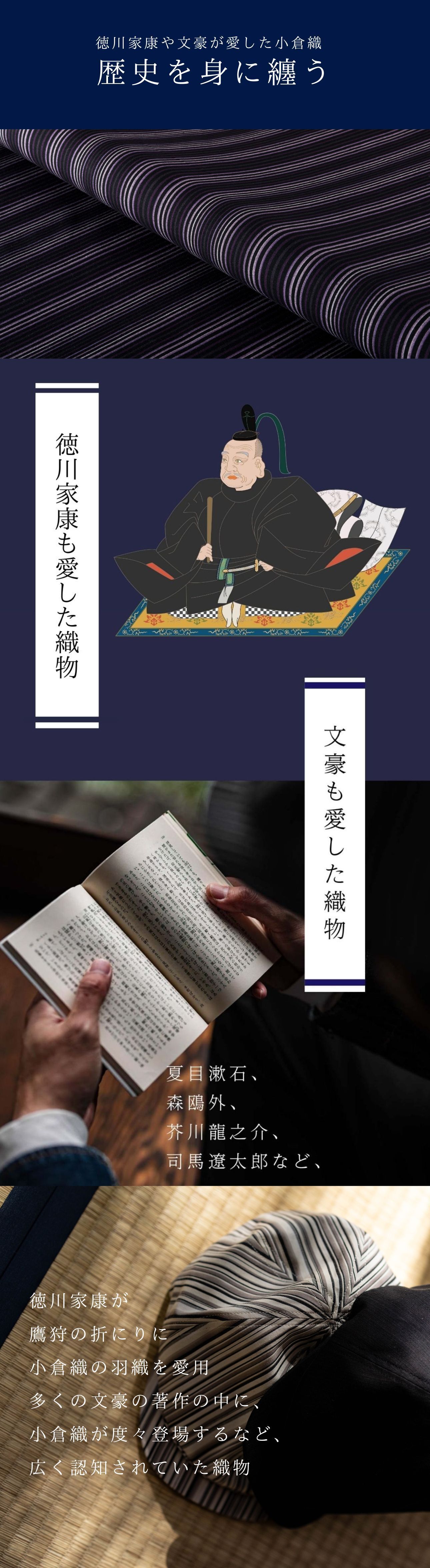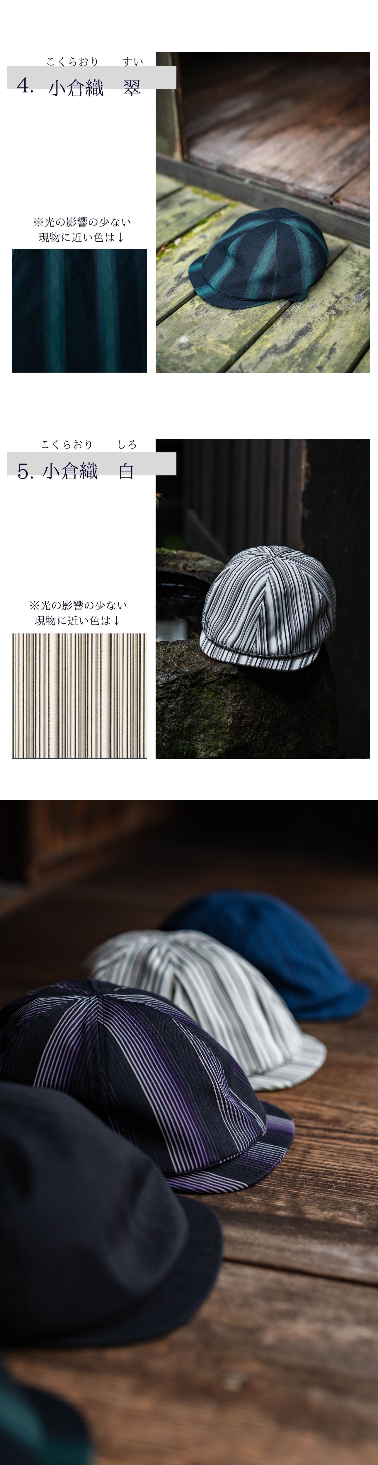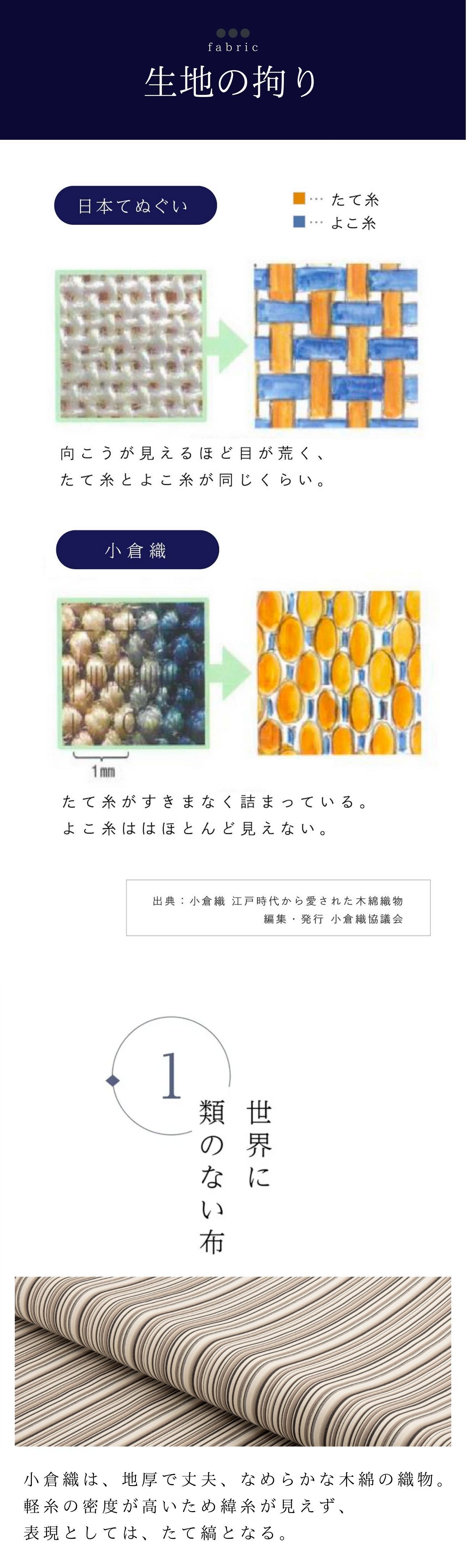 小倉織は綿100%の素材を使用しています。水洗いすると多少収縮することがあります。アパレル製品は手洗いをしてください。タンブラー乾燥は行わないでください。アイロンは、あて布をご使用ください。また、摩擦や水濡れ(雨・汗など)は、日焼けによる色落ち、色移り、退色の原因になります。汗の多い状況や、雨天時でのご使用や、淡い色の服装に合わせてご使用の場合も十分にご注意ください。生地だけで構成された製品に関しては、洗濯時に他の衣類に色が移る場合がございますので単独で洗ってください。軽い汚れは、柔らかいブラシや乾いた布で落としてください。汗が付着した状態で、長時間日光に当たると変色する恐れがありますのでご注意ください。