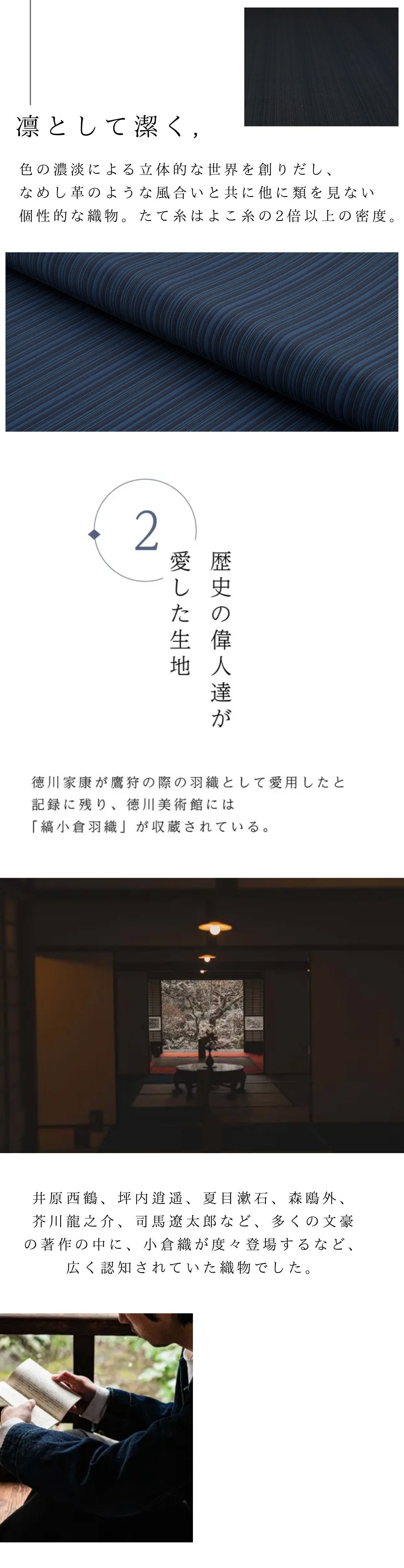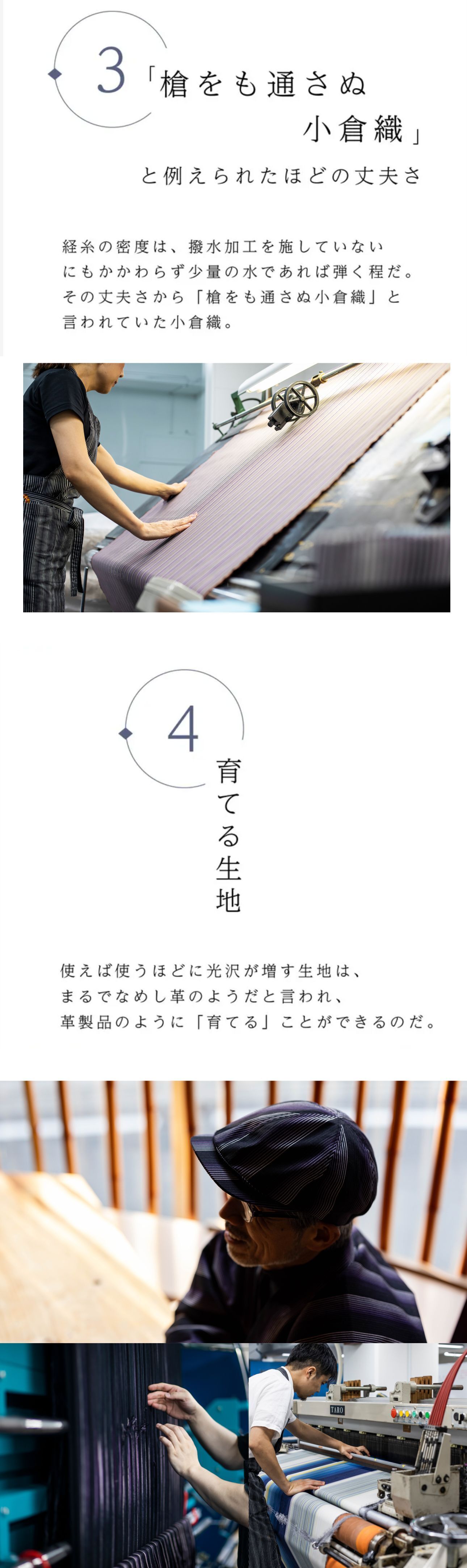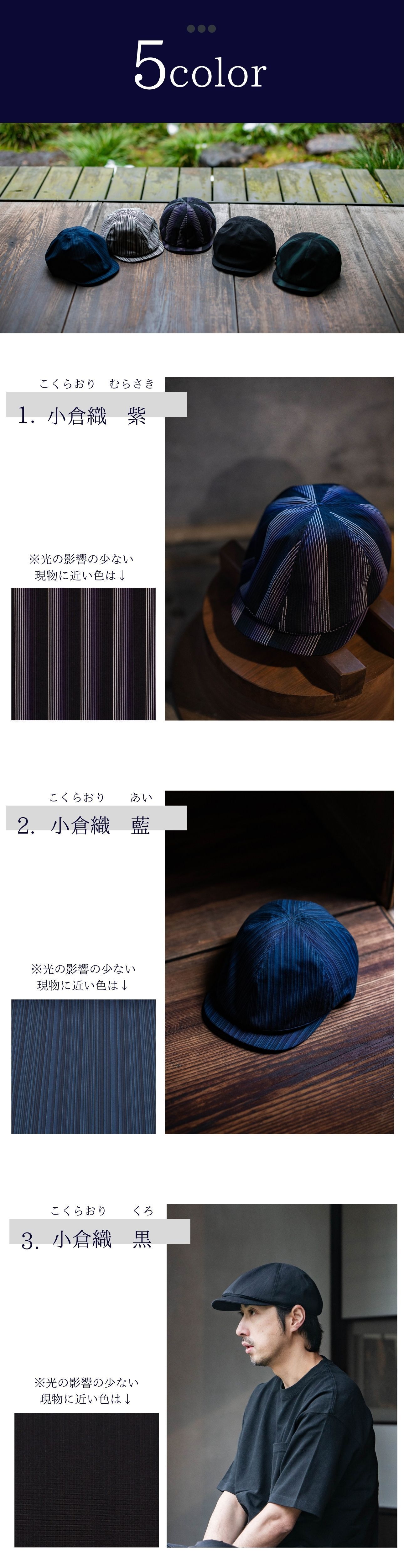 小倉織は綿100%の素材を使用しています。水洗いすると多少収縮することがあります。アパレル製品は手洗いをしてください。タンブラー乾燥は行わないでください。アイロンは、あて布をご使用ください。また、摩擦や水濡れ(雨・汗など)は、日焼けによる色落ち、色移り、退色の原因になります。汗の多い状況や、雨天時でのご使用や、淡い色の服装に合わせてご使用の場合も十分にご注意ください。生地だけで構成された製品に関しては、洗濯時に他の衣類に色が移る場合がございますので単独で洗ってください。軽い汚れは、柔らかいブラシや乾いた布で落としてください。汗が付着した状態で、長時間日光に当たると変色する恐れがありますのでご注意ください。
